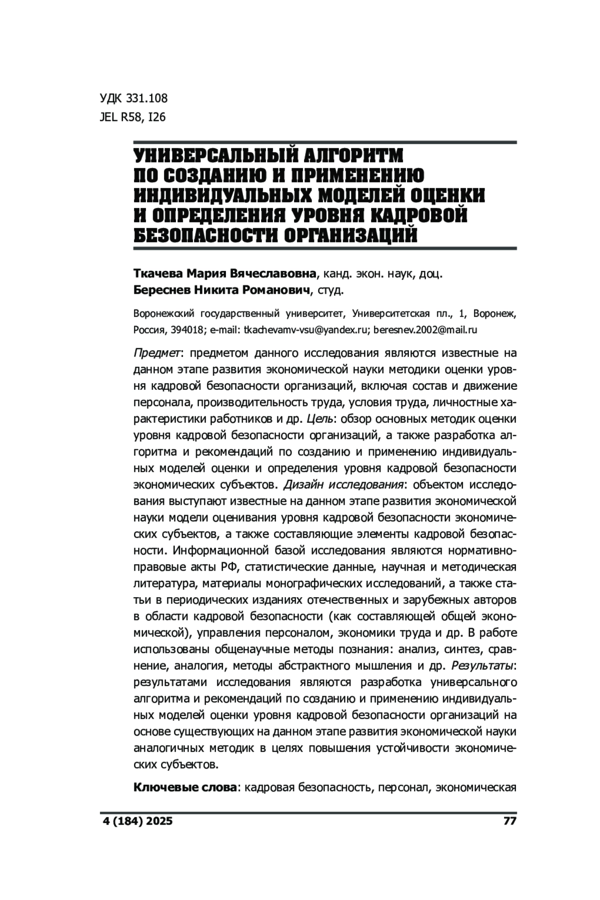 12. Ткачева М.В., Береснев Н.Р. Кадровые угрозы как основной деструктивный фактор экономической безопасности организации // Научные труды Вольного экономического общества России, 2024, no. 6 (т. 250), с. 343-364. Доступно: https://cyberleninka.ru/article/n/kadrovyeugrozy-kak-osnovnoy-destruktivnyy-faktorekonomicheskoy-bezopasnosti-organizatsii (дата обращения: 21.04.2025). EDN: WOMWFN