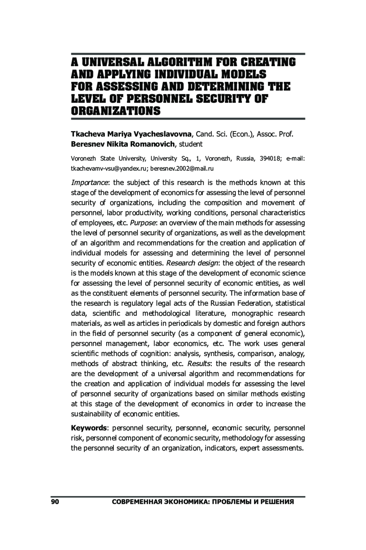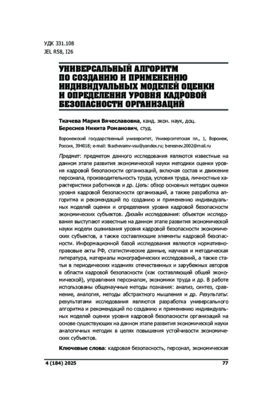 Предмет: предметом данного исследования являются известные на данном этапе развития экономической науки методики оценки уровня кадровой безопасности организаций, включая состав и движение персонала, производительность труда, условия труда, личностные характеристики работников и др. Цель: обзор основных методик оценки уровня кадровой безопасности организаций, а также разработка алгоритма и рекомендаций по созданию и применению индивидуальных моделей оценки и определения уровня кадровой безопасности экономических субъектов. Дизайн исследования: объектом исследования выступают известные на данном этапе развития экономической науки модели оценивания уровня кадровой безопасности экономических субъектов, а также составляющие элементы кадровой безопасности. Информационной базой исследования являются нормативноправовые акты РФ, статистические данные, научная и методическая литература, материалы монографических исследований, а также статьи в периодических изданиях отечественных и зарубежных авторов в области кадровой безопасности (как составляющей общей экономической), управления персоналом, экономики труда и др. В работе использованы общенаучные методы познания: анализ, синтез, сравнение, аналогия, методы абстрактного мышления и др. Результаты: результатами исследования являются разработка универсального алгоритма и рекомендаций по созданию и применению индивидуальных моделей оценки уровня кадровой безопасности организаций на основе существующих на данном этапе развития экономической науки аналогичных методик в целях повышения устойчивости экономических субъектов.