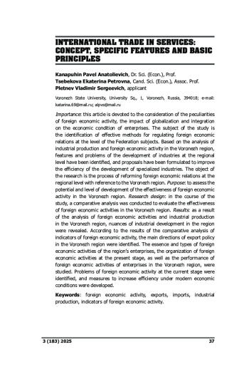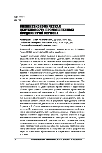 Предмет: настоящая статья посвящена рассмотрению особенностей осуществления внешнеэкономической деятельности, влиянию глобализации и интеграции на экономическое состояние предприятий. Предметом исследования являются выявление эффективных методов регулирования внешнеэкономических связей на уровне субъектов Федерации. На основе проведенного анализа промышленного производства и внешнеэкономической деятельности Воронежской области выделены особенности и проблемы развития отраслей промышленности на региональном уровне и сформулированы предложения по повышению эффективности развития отраслей специализации. Объектом исследования является процесс реформирования внешнеэкономических связей на уровне региона применительно к Воронежской области. Цель: оценить потенциал и уровень развития эффективности внешнеэкономической деятельности Воронежской области. Дизайн исследования: в ходе исследования проводился сравнительный анализ оценки эффективности внешнеэкономической деятельности Воронежской области. Результаты: в результате проведенного анализа внешнеэкономической деятельности и промышленного производства Воронежской области выявлены нюансы развития промышленности в регионе. По результатам сравнительного анализа показателей внешнеэкономической деятельности выявлены основные направления экспортной политики Воронежской области. Изучены сущность и виды внешнеэкономической деятельности предприятий региона, организация внешнеэкономической деятельности на современном этапе; проанализирована результативность внешнеэкономической деятельности предприятий Воронежской области; выявлены проблемы внешнеэкономической деятельности на современном этапе; разработаны меры по повышению эффективности в современных экономических условиях.