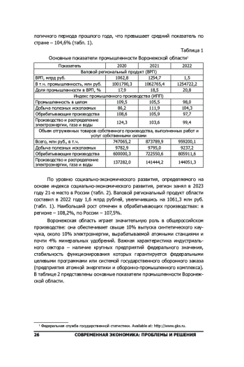 Исследуемый нами регион входит в состав Центрального федерального округа (ЦФО) и граничит с 7 субъектами Российской Федерации. Изучая характеристики становления и роста Воронежской области, стоит подчеркнуть, что этот регион представляет собой значимый промышленный центр Центрального федерального округа с разнообразной производственной структурой, охватывающей выработку электроэнергии, продуктов питания, химикатов, резины и пластика, транспорта, машиностроения, готовой металлической продукции, иных видов неметаллических минеральных материалов и прочих товаров. Ключевым элементом промышленной сферы Воронежской области выступает присутствие крупных федеральных предприятий, деятельность которых поддерживается через федеральные программы, включая государственный оборонный заказ [2].