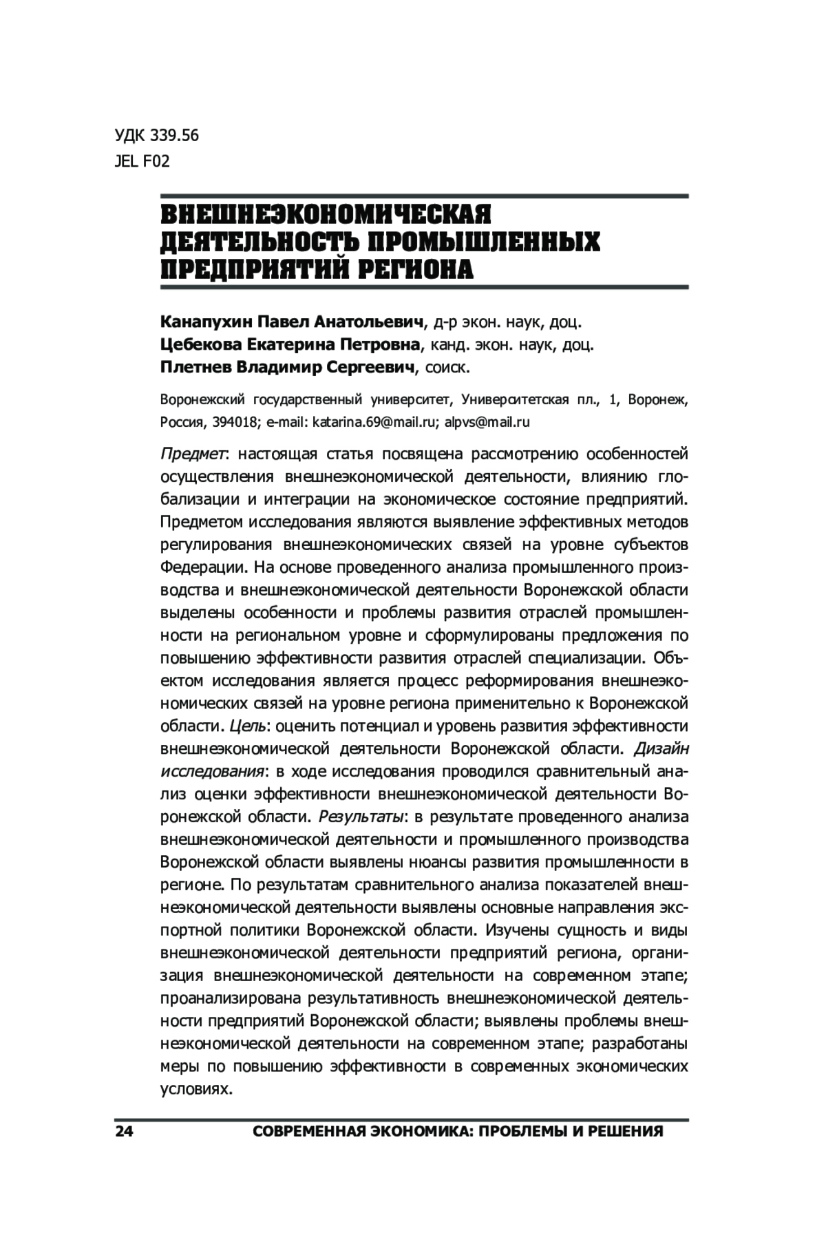7. Решетова К.В., Безпалов В.В. Внешнеэкономическая деятельность регионов как инструмент повышения национальной экономической безопасности страны на примере Воронежской области // В сборнике: Наука сегодня: Факты, тенденции, прогнозы. Материалы Международной научно-практической конференции. Научный центр “Диспут”, 2017, с. 110-116. EDN: ZAROXF