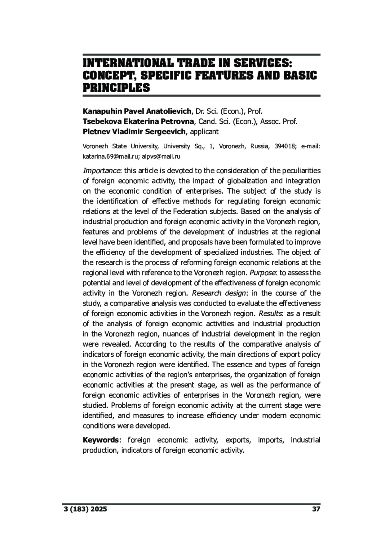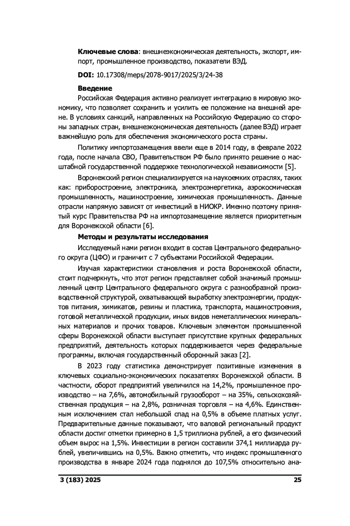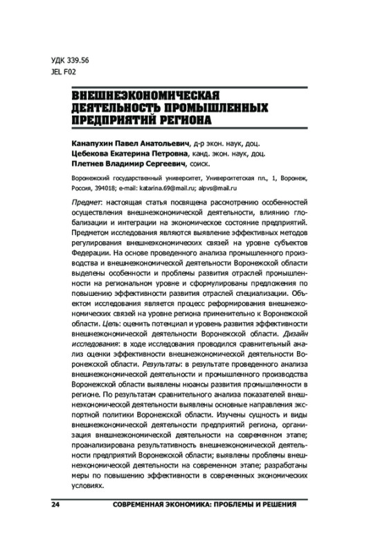 1. Безпалов В.В., Лочан С.А., Федюнин Д.В. Роль внешнеторговой деятельности региональных промышленных комплексов в условиях реализации политики импортозамещения // Инновации и инвестиции, 2016, no. 10, c. 144-147. EDN: ZNEBRT