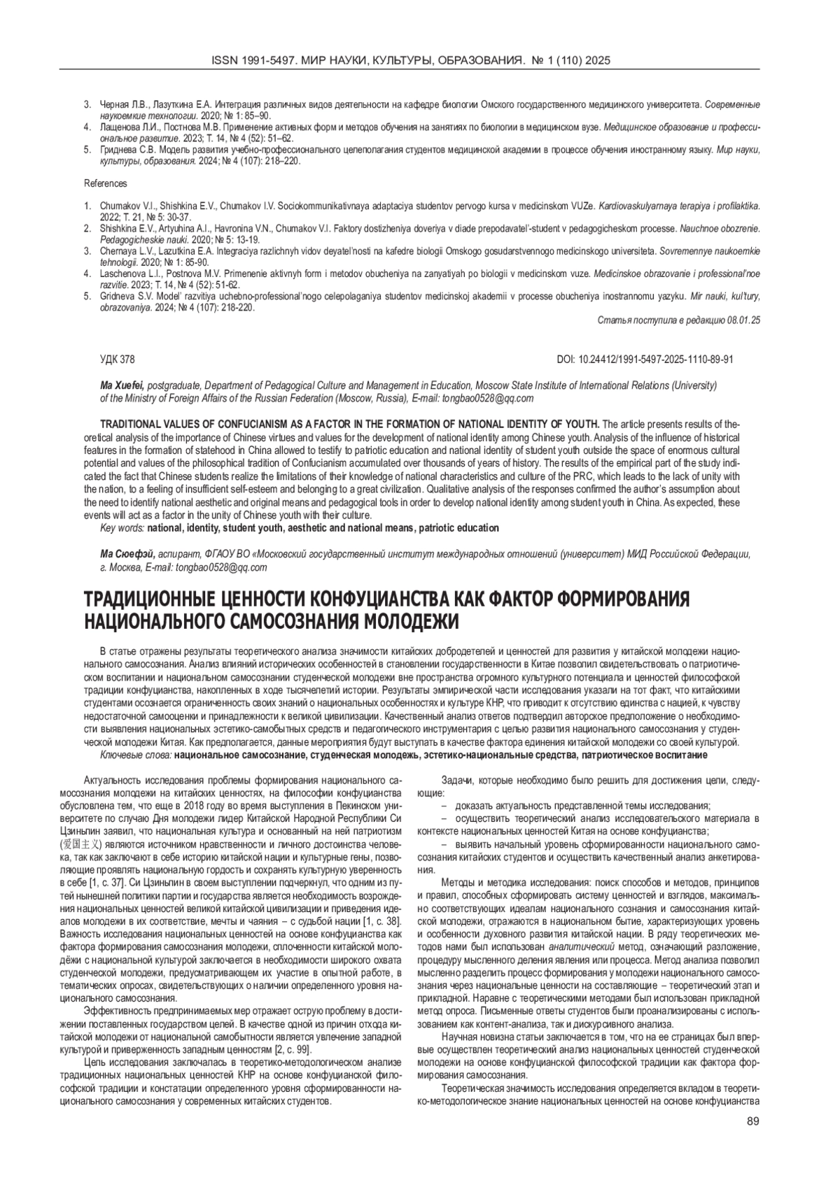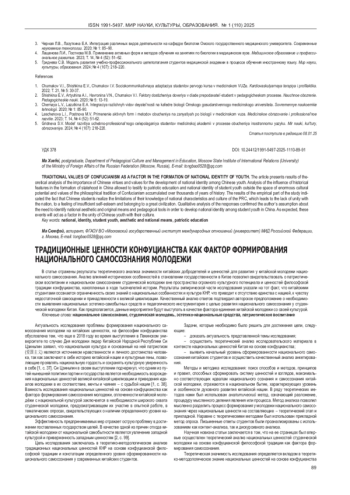 В статье отражены результаты теоретического анализа значимости китайских добродетелей и ценностей для развития у китайской молодежи национального самосознания. Анализ влияний исторических особенностей в становлении государственности в Китае позволил свидетельствовать о патриотическом воспитании и национальном самосознании студенческой молодежи вне пространства огромного культурного потенциала и ценностей философской традиции конфуцианства, накопленных в ходе тысячелетий истории. Результаты эмпирической части исследования указали на тот факт, что китайскими студентами осознается ограниченность своих знаний о национальных особенностях и культуре КНР, что приводит к отсутствию единства с нацией, к чувству недостаточной самооценки и принадлежности к великой цивилизации. Качественный анализ ответов подтвердил авторское предположение о необходимости выявления национальных эстетико-самобытных средств и педагогического инструментария с целью развития национального самосознания у студенческой молодежи Китая. Как предполагается, данные мероприятия будут выступать в качестве фактора единения китайской молодежи со своей культурой.