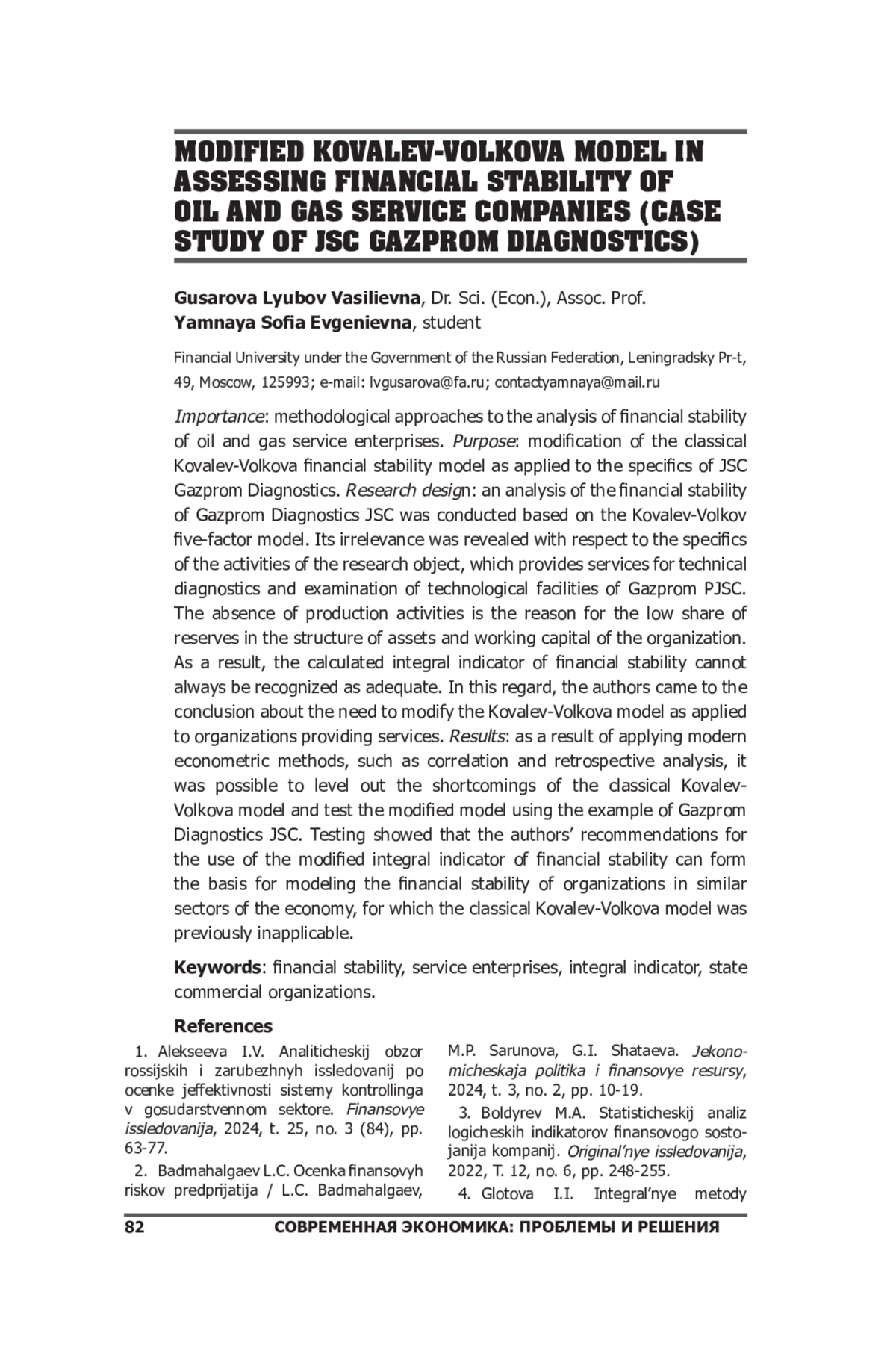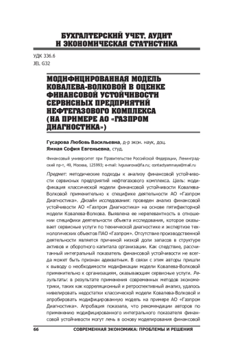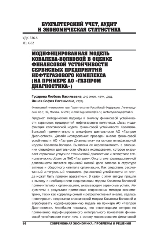 Предмет: методические подходы к анализу финансовой устойчивости сервисных предприятий нефтегазового комплекса. Цель: модификация классической модели финансовой устойчивости Ковалева-Волковой применительно к специфике деятельности АО «Газпром Диагностика». Дизайн исследования: проведен анализ финансовой устойчивости АО «Газпром Диагностика» на основе пятифакторной модели Ковалева-Волкова. Выявлена ее нерелевантность в отношении специфики деятельности объекта исследования, которое оказывает сервисные услуги по технической диагностике и экспертизе технологических объектов ПАО «Газпром». Отсутствие производственной деятельности является причиной низкой доли запасов в структуре активов и оборотного капитала организации. Как следствие, рассчитанный интегральный показатель финансовой устойчивости не всегда может быть признан адекватным. В связи с этим авторы пришли к выводу о необходимости модификации модели Ковалева-Волковой применительно к организациям, оказывающим сервисные услуги. Результаты: в результате применения современных методов эконометрики, таких как корреляционный и ретроспективный анализ, удалось нивелировать недостатки классической модели Ковалева-Волковой и апробировать модифицированную модель на примере АО «Газпром Диагностика». Апробация показала, что рекомендации авторов по применению модифицированного интегрального показателя финансовой устойчивости могут лечь в основу моделирования финансовой устойчивости организаций в схожих отраслях экономики, для которых ранее классическая модель Ковалева-Волковой была неприменима.