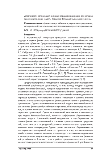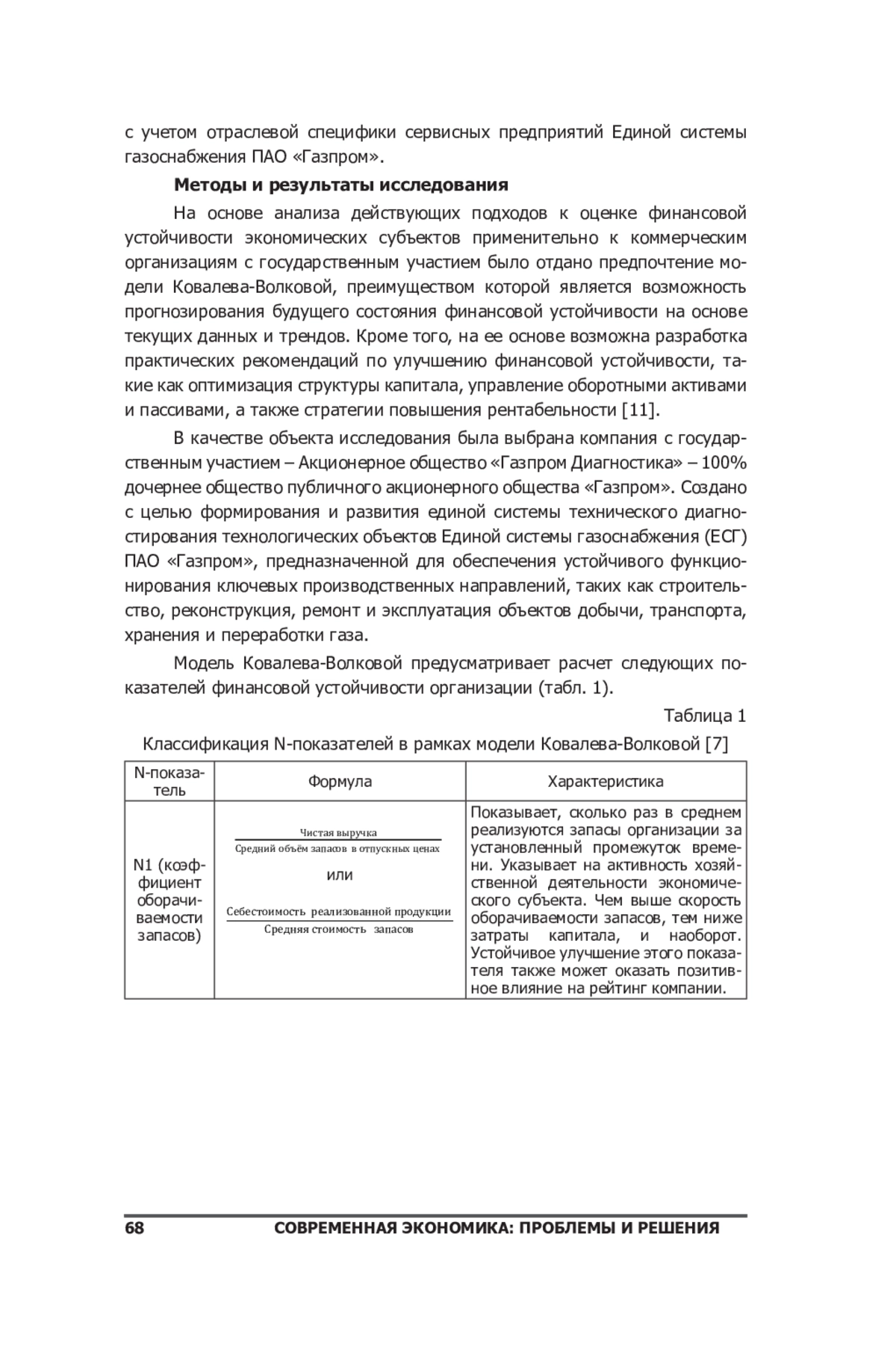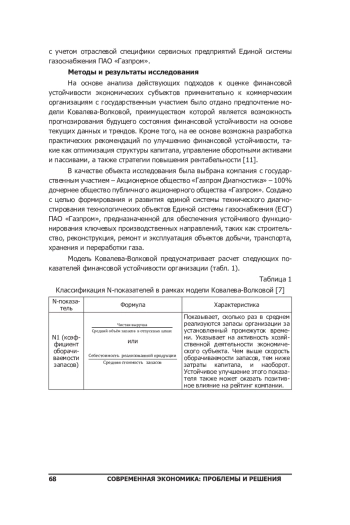 Среди рассмотренных методических подходов для целей исследования финансовой устойчивости организаций, на наш взгляд, следует выделить модель Ковалева-Волковой, которая предполагает не только статический анализ финансовых показателей на определенный момент времени, но и динамическое наблюдение за изменениями показателей в течение длительных периодов времени, что позволяет выявить тенденции и оценить влияние внешних и внутренних факторов на финансовое состояние и устойчивость организации. Однако применение классической модели Ковалева-Волковой для анализа финансовой устойчивости организаций выявило ряд недостатков, основным из которых является игнорирование специфики деятельности сервисных организаций. Одним из показателей, включенных в пятифакторную модель Ковалева-Волковой, является коэффициент оборачиваемости запасов. Модель Ковалева-Волковой создавалась и апробировалась на основе финансовых показателей в основном производственных предприятий, доля запасов в структуре оборотного капитала которых традиционно занимает значительную долю.