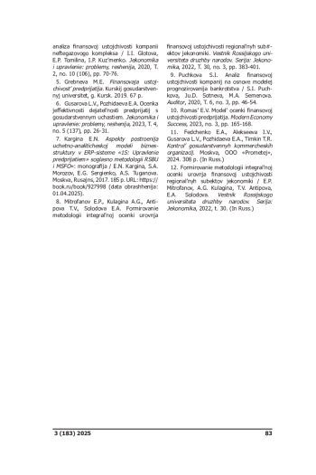 12. Формирование методологии интегральной оценки уровня финансовой устойчивости региональных субъектов экономики / Е.П. Митрофанов, А.Г. Кулагина, Т.В. Антипова, Е.А. Солодова // Вестник Российского университета дружбы народов. Серия: Экономика, 2022, и. 30. EDN: EMVDJU