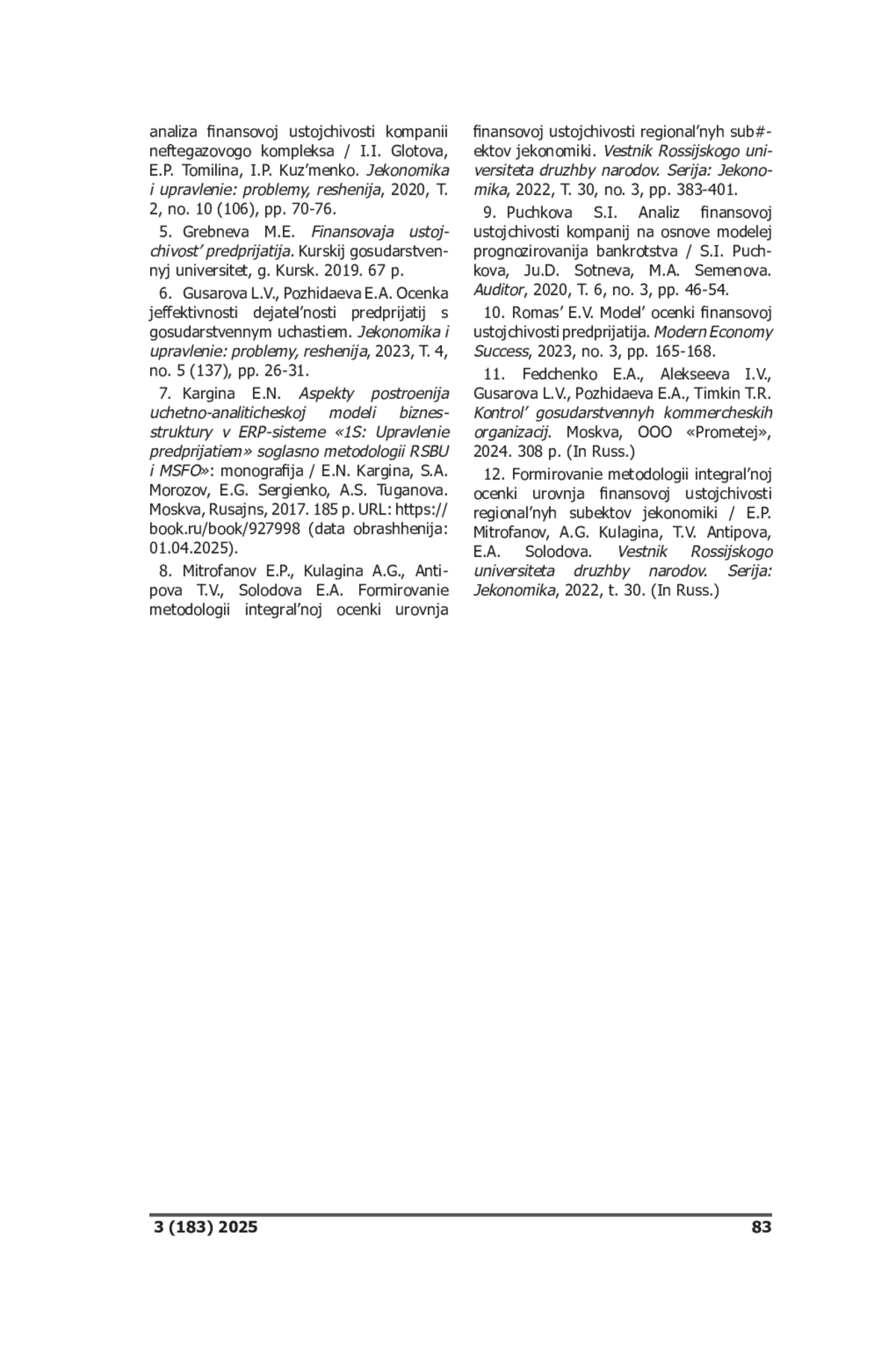 8. Митрофанов Е.П., Кулагина А.Г., Антипова Т.В., Солодова Е.А. Формирование методологии интегральной оценки уровня финансовой устойчивости региональных субъектов экономики // Вестник Российского университета дружбы народов. Серия: Экономика, 2022, т. 30, no. 3, с. 383-401. EDN: EMVDJU