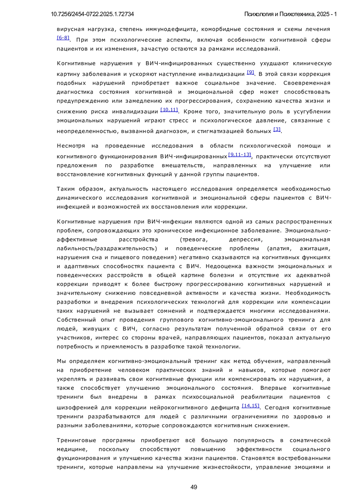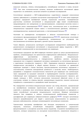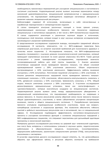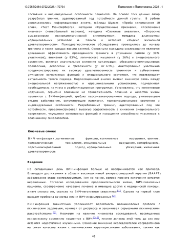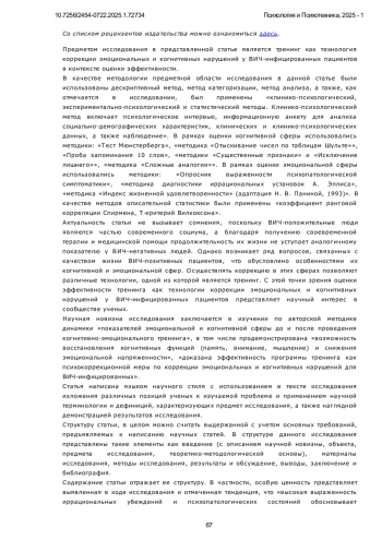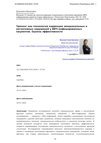 Предметом исследования является эмоциональная сфера и когнитивные функции (память, внимание, мышление) пациентов с ВИЧ-инфекцией. Объект исследования - пациенты с ВИЧ-инфекцией. Автор подробно анализирует когнитивные нарушения у данной категории пациентов, которые оказывают значительное влияние на приверженность лечению, эмоциональную стабильность и снижение качества жизни. В центре внимания находится опыт проведения группового тренинга, эффективность которого подтверждена улучшением эмоционального состояния и когнитивных функций участников. Исследование подчеркивает важность персонализированного подхода к оценке и коррекции когнитивных функций и эмоциональных нарушений, учитывая такие факторы, как стадия заболевания, сопутствующие патологии, психоэмоциональное состояние и индивидуальные особенности пациентов. На основе этих данных автор разработал тренинг, адаптированный под потребности данной группы. В работе использовались информационная анкета, таблицы Шульте, «Проба запоминания 10 слов»,«Тест Мюнстерберга», методики «Существенные признаки», «Исключение лишнего» (невербальный вариант), методика «Сложные аналогии», «Опросник выраженности психопатологической симптоматики», методика диагностики иррациональных установок А. Эллиса и методика «Индекс жизненной удовлетворенности». Психодиагностическое обследование проводилось до начала тренинга и после каждых восьми занятий. Основными выводами исследования являются доказанная эффективность проведенного тренинга в улучшении памяти (у 39% участников), внимания (у 83%), логического мышления (у 36%) и эмоционального состояния, включая значительное снижение соматизации, обсессивно-компульсивных проявлений, депрессии и тревожности (у 47-63%). Анкетирование участников продемонстрировало их высокую удовлетворенность тренингом и субъективное улучшение когнитивных функций и эмоционального состояния, что подтверждает актуальность такого подхода. Корреляционный анализ выявил значимую связь между эмоциональной напряженностью и иррациональными установками, подчеркивая необходимость их учета в реабилитационных программах. Установлено, что когнитивные нарушения, серьезно влияющие на приверженность лечению и качество жизни пациентов с ВИЧ-инфекцией, требуют персонализированного подхода, учитывающего стадию заболевания, сопутствующие патологии, психоэмоциональное состояние и индивидуальные особенности. Разработанный тренинг, адаптированный под эти потребности, продемонстрировал высокую эффективность в снижении эмоционального напряжения, улучшении когнитивных функций и повышении способности участников к осознанному саморазвитию.
