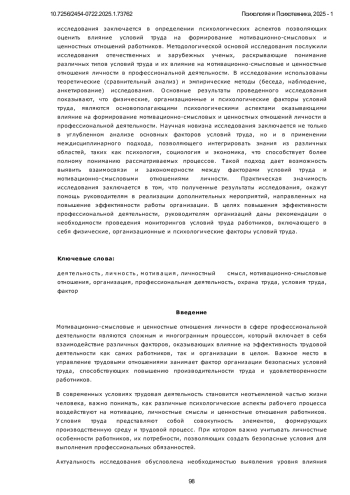 В статье рассмотрены основные факторы условий труда и их влияние на мотивационно-смысловые и ценностные отношения личности в профессиональной деятельности. Актуальность проведения исследования состоит в изучении структуры условий труда с психологической точки зрения позволяющее выявить психологические аспекты и оценить их влияние на мотивацию, личностные смыслы и ценностные отношения работников организации. Понимание данных аспектов позволит определить, какие именно факторы условий труда побуждают работников к активным действиям. Объектом исследования выступают мотивационно-смысловые и ценностные отношения личности. Предметом данного исследования являются факторы условий труда, влияющие на мотивационно-смысловые и ценностные отношения работников. Цель исследования заключается в определении психологических аспектов позволяющих оценить влияние условий труда на формирование мотивационно-смысловых и ценностных отношений работников. Методологической основой исследования послужили исследования отечественных и зарубежных ученых, раскрывающие понимание различных типов условий труда и их влияние на мотивационно-смысловые и ценностные отношения личности в профессиональной деятельности. В исследовании использованы теоретические (сравнительный анализ) и эмпирические методы (беседа, наблюдение, анкетирование) исследования. Основные результаты проведенного исследования показывают, что физические, организационные и психологические факторы условий труда, являются основополагающими психологическими аспектами оказывающими влияние на формирование мотивационно-смысловых и ценностных отношений личности в профессиональной деятельности. Научная новизна исследования заключается не только в углубленном анализе основных факторов условий труда, но и в применении междисциплинарного подхода, позволяющего интегрировать знания из различных областей, таких как психология, социология и экономика, что способствует более полному пониманию рассматриваемых процессов. Такой подход дает возможность выявить взаимосвязи и закономерности между факторами условий труда и мотивационно-смысловыми отношениями личности. Практическая значимость исследования заключается в том, что полученные результаты исследования, окажут помощь руководителям в реализации дополнительных мероприятий, направленных на повышение эффективности работы организации. В целях повышения эффективности профессиональной деятельности, руководителям организаций даны рекомендации о необходимости проведения мониторингов условий труда работников, включающего в себя физические, организационные и психологические факторы условий труда.