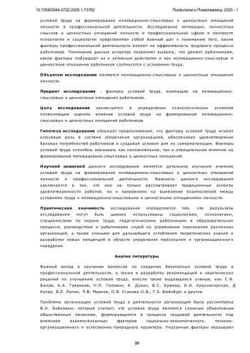 Мотивационно-смысловые и ценностные отношения личности в сфере профессиональной деятельности являются сложным и многогранным процессом, который включает в себя взаимодействие различных факторов, оказывающих влияние на эффективность трудовой деятельности как самих работников, так и организации в целом. Важное место в управление трудовыми отношениями занимает фактор организации безопасных условий труда, способствующих повышению производительности труда и удовлетворенности работников.