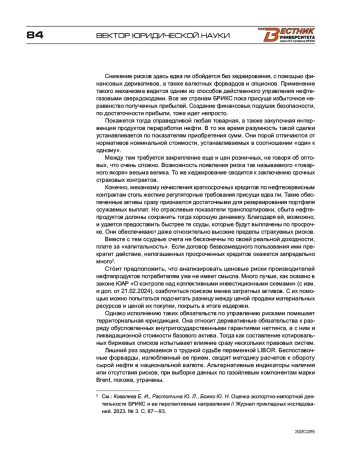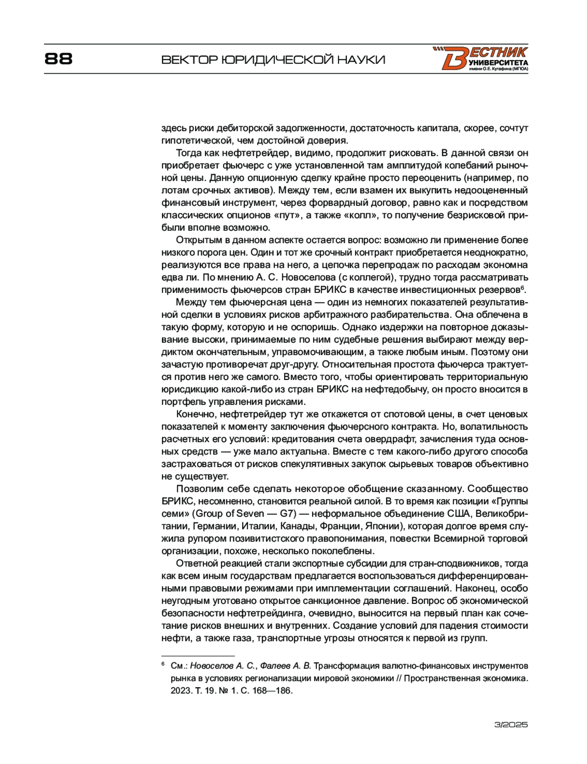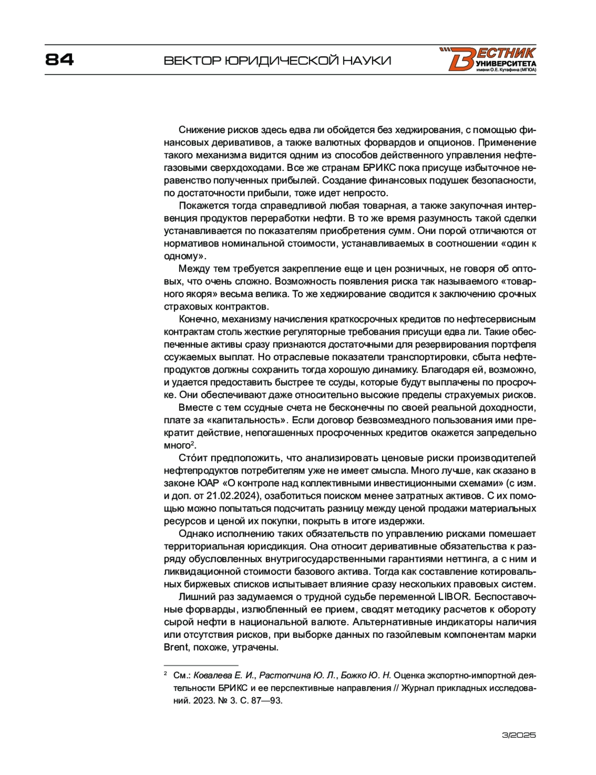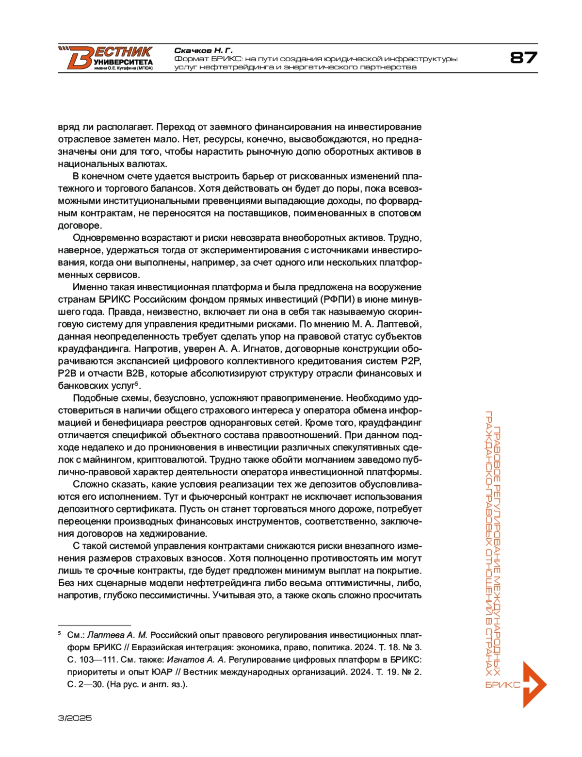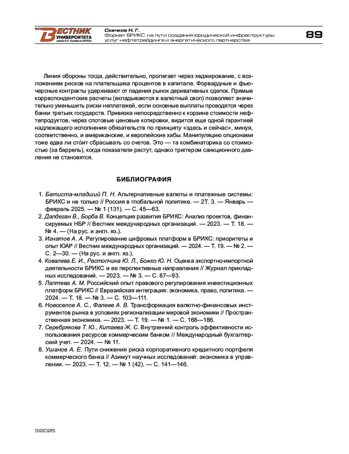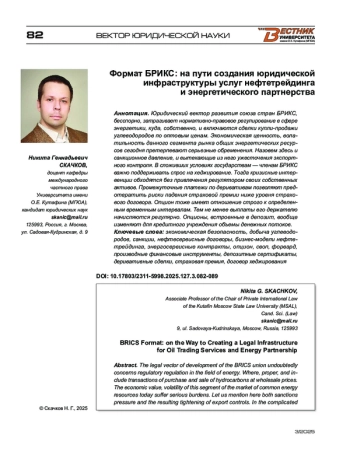 СКАЧКОВ Н. Г. ФОРМАТ БРИКС: НА ПУТИ СОЗДАНИЯ ЮРИДИЧЕСКОЙ ИНФРАСТРУКТУРЫ УСЛУГ НЕФТЕТРЕЙДИНГА И ЭНЕРГЕТИЧЕСКОГО ПАРТНЕРСТВА // ВЕСТНИК УНИВЕРСИТЕТА ИМЕНИ О.Е. КУТАФИНА (МГЮА). 2025. № 3 (127)