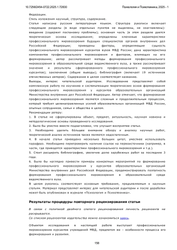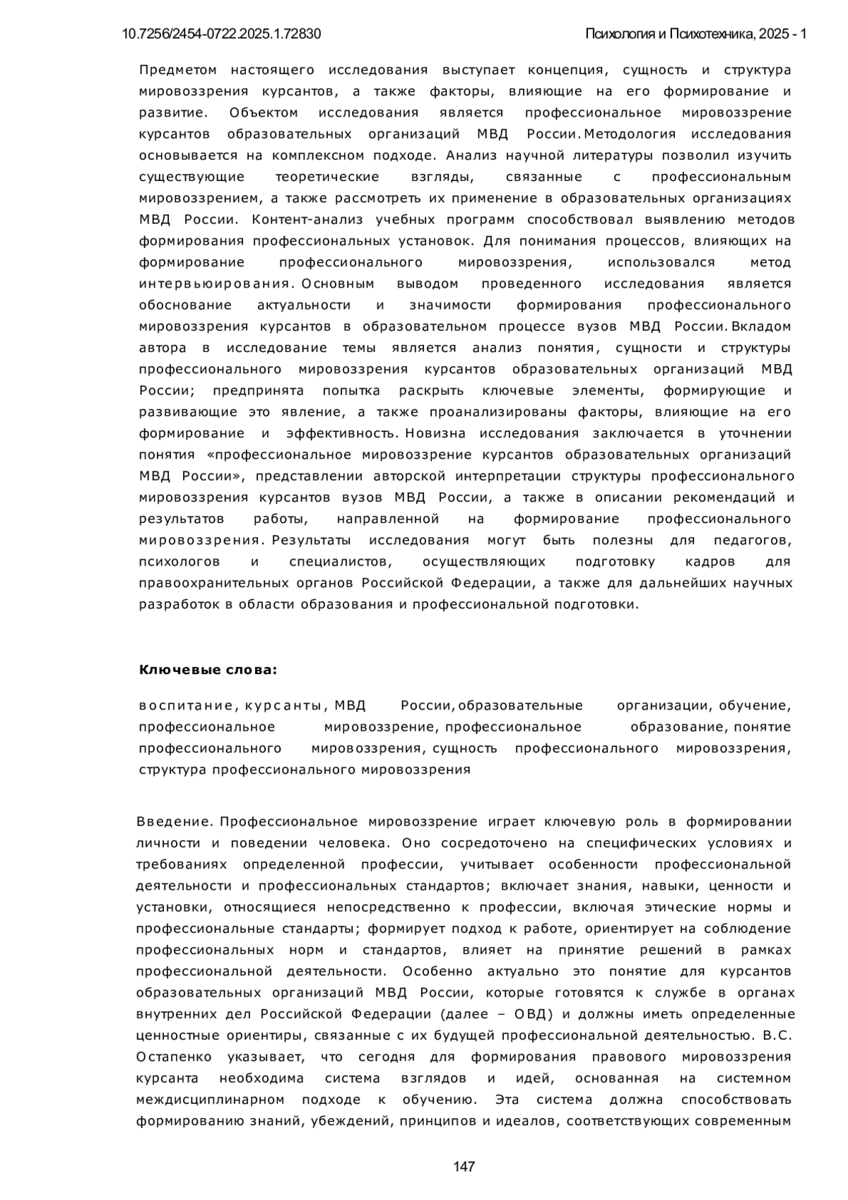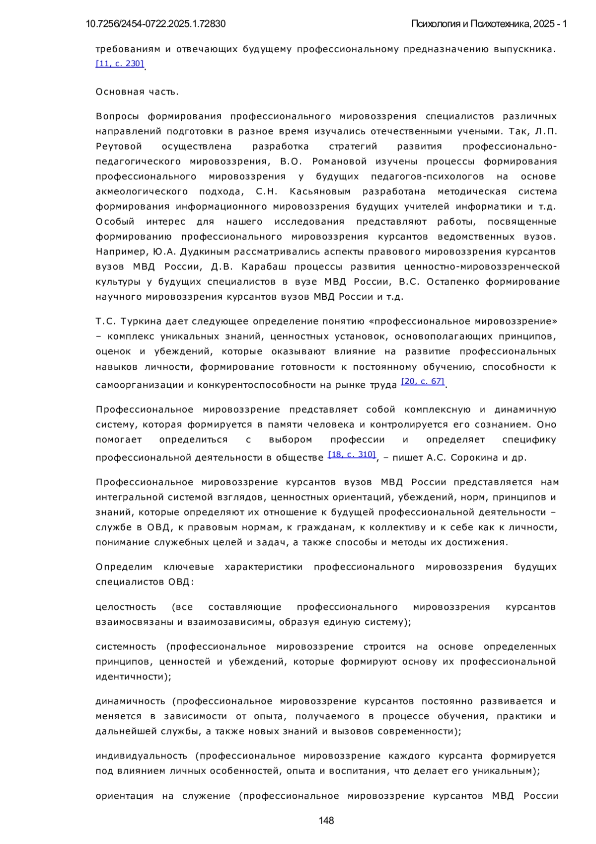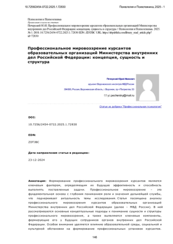 ПЕЧЕРСКИЙ Ю. И. ПРОФЕССИОНАЛЬНОЕ МИРОВОЗЗРЕНИЕ КУРСАНТОВ ОБРАЗОВАТЕЛЬНЫХ ОРГАНИЗАЦИЙ МИНИСТЕРСТВА ВНУТРЕННИХ ДЕЛ РОССИЙСКОЙ ФЕДЕРАЦИИ: КОНЦЕПЦИЯ, СУЩНОСТЬ И СТРУКТУРА // ПСИХОЛОГИЯ И ПСИХОТЕХНИКА. 2025. № 1