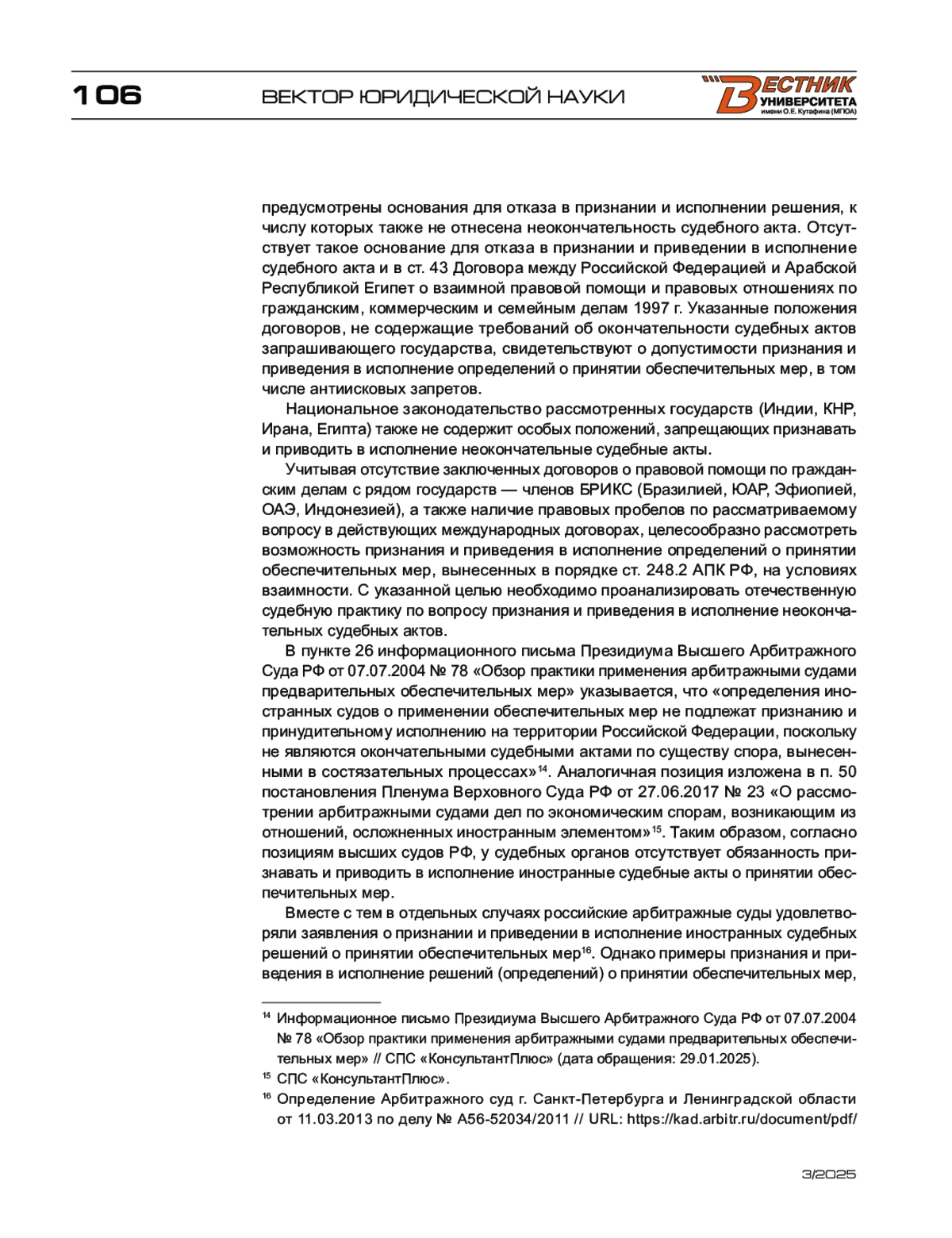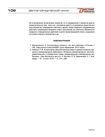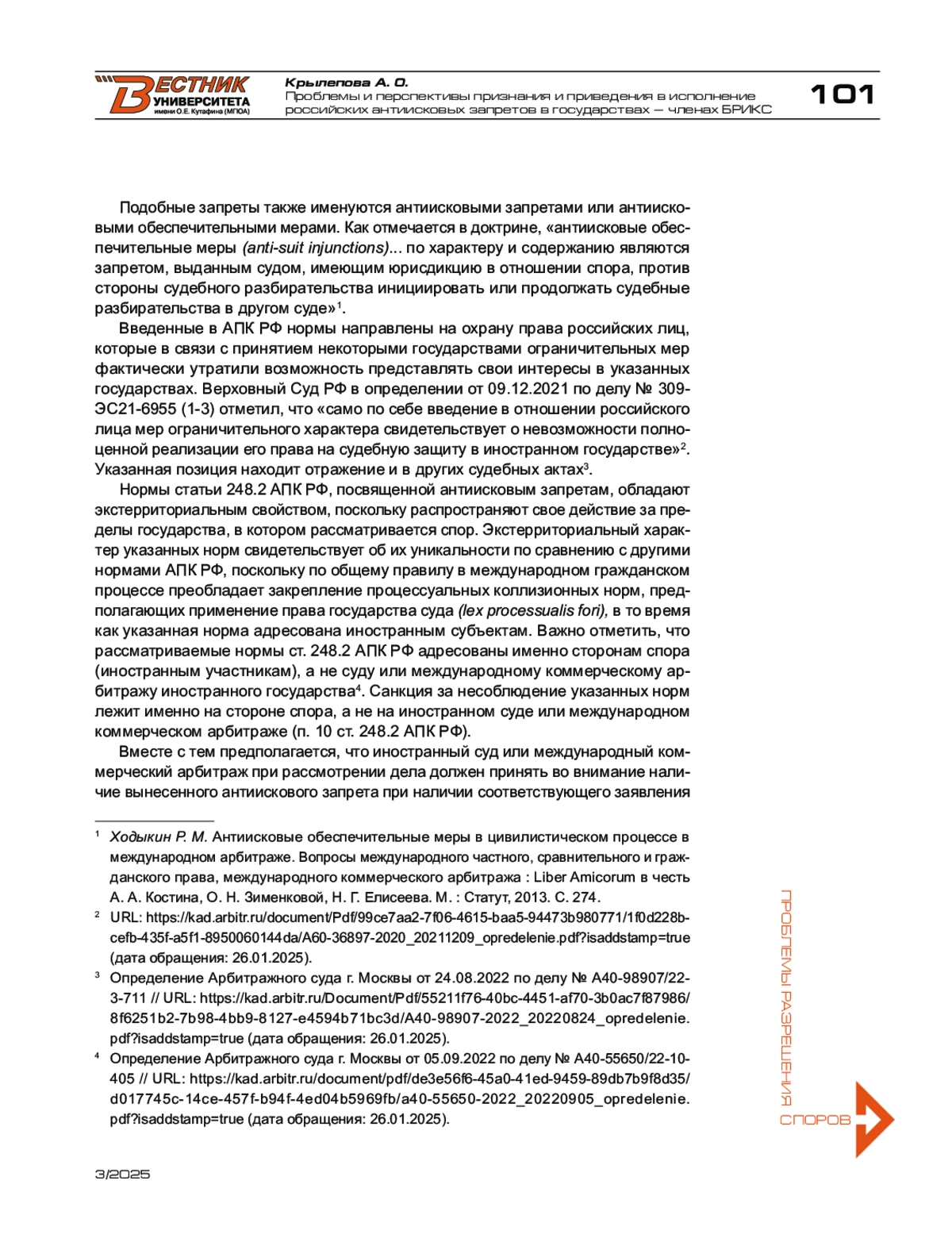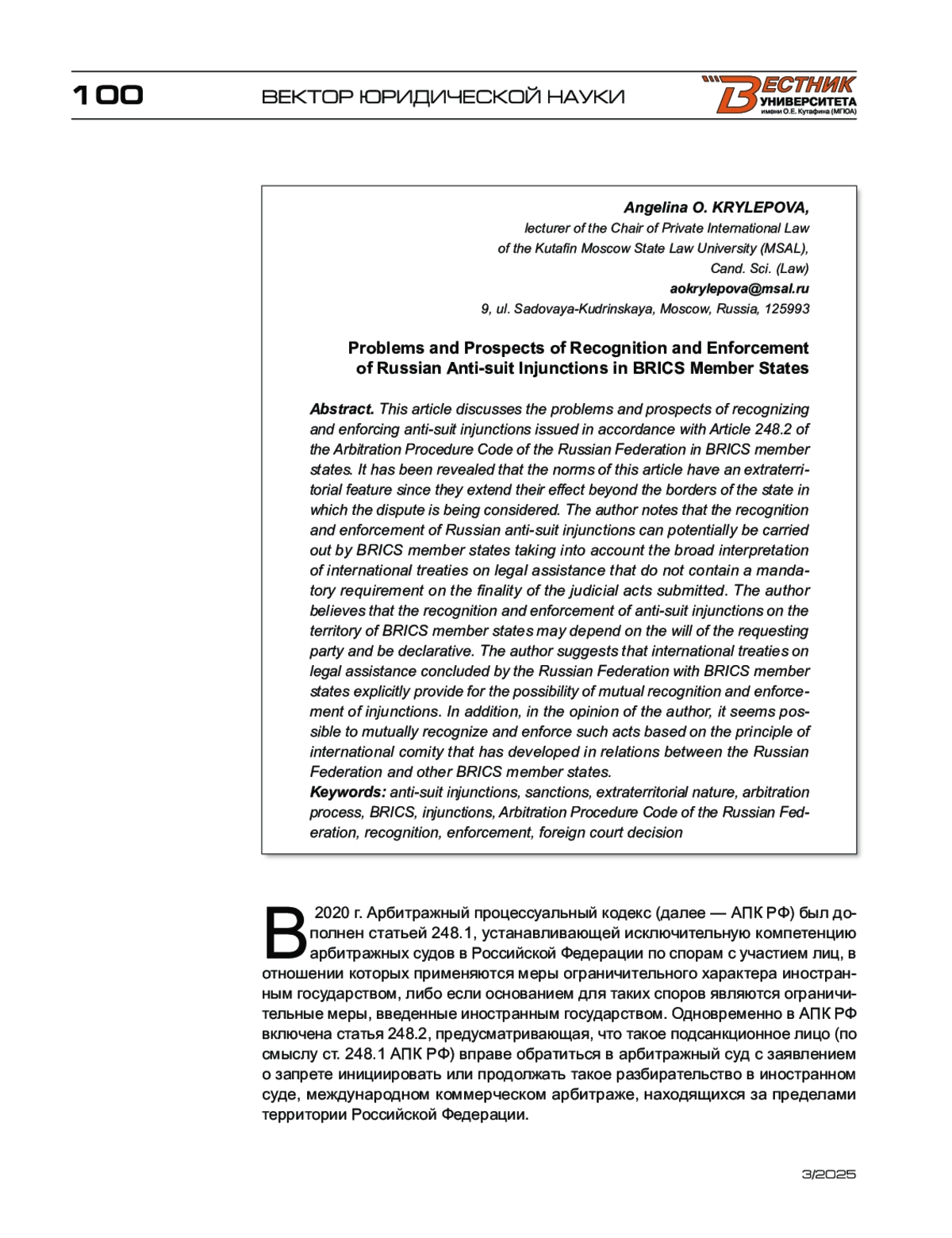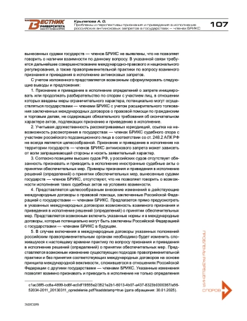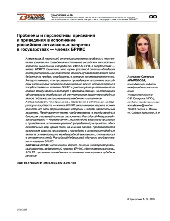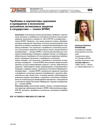 КРЫЛЕПОВА А. О. ПРОБЛЕМЫ И ПЕРСПЕКТИВЫ ПРИЗНАНИЯ И ПРИВЕДЕНИЯ В ИСПОЛНЕНИЕ РОССИЙСКИХ АНТИИСКОВЫХ ЗАПРЕТОВ В ГОСУДАРСТВАХ — ЧЛЕНАХ БРИКС // ВЕСТНИК УНИВЕРСИТЕТА ИМЕНИ О.Е. КУТАФИНА (МГЮА). 2025. № 3 (127)