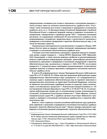 Автор полагает, что признание и приведение в исполнение на территории государств — членов БРИКС антиискового запрета может зависеть от воли запрашивающей стороны и носить заявительный характер. Предлагается прямо предусмотреть в международных договорах о правовой помощи, заключенных Российской Федерацией с государствами — членами БРИКС, возможность взаимного признания и приведения в исполнение решений (определений) о принятии обеспечительных мер. Кроме того, по мнению автора, представляется возможным взаимно признавать и приводить в исполнение подобные акты на основе принципа международной вежливости, сложившегося в отношениях между Российской Федерацией и другими государствами — членами БРИКС.