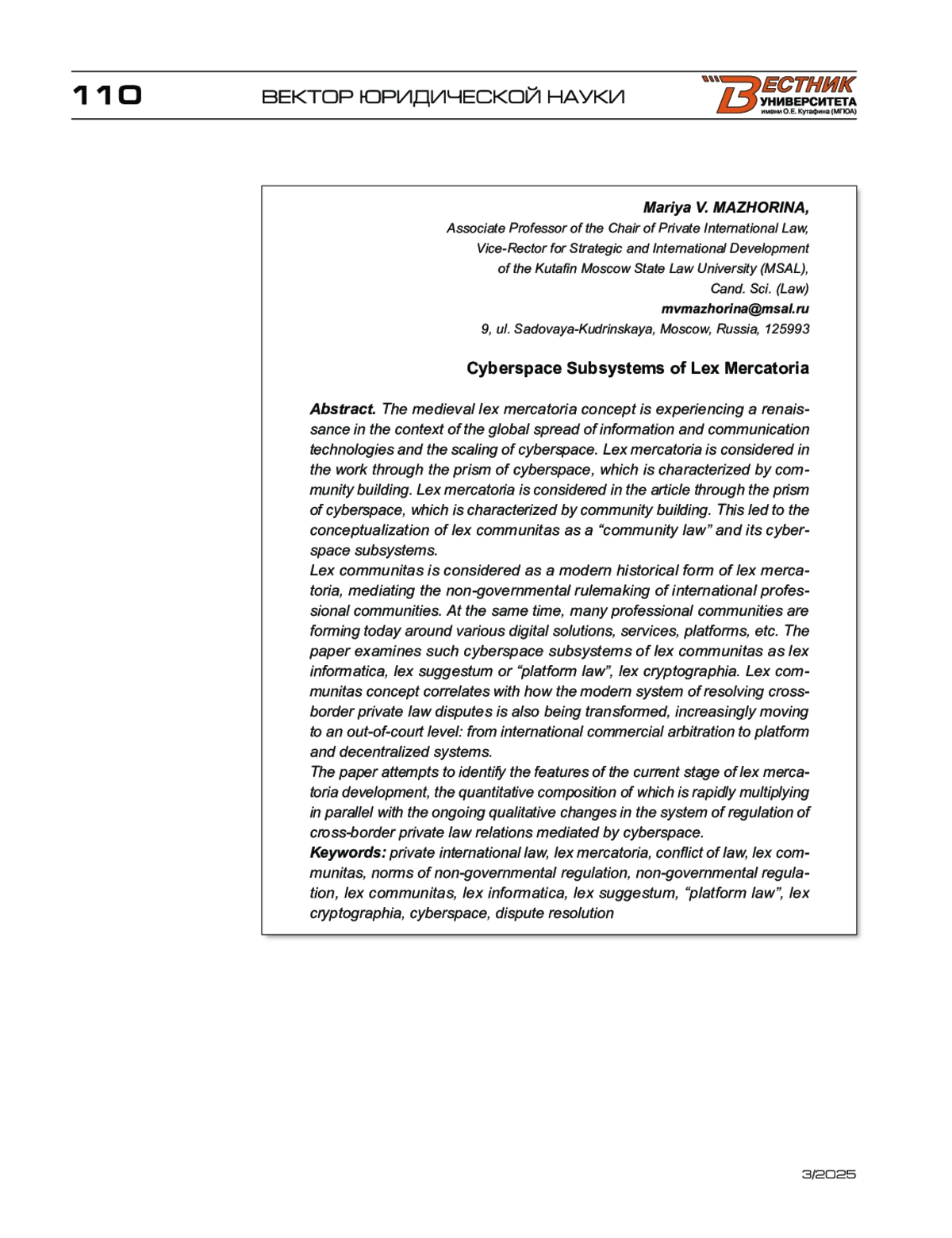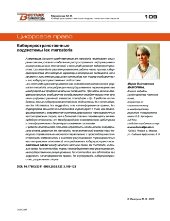 Концепт средневекового lex mercatoria переживает эпоху ренессанса в условиях глобального распространения информационнокоммуникационных технологий и масштабирования киберпространства. Lex mercatoria рассматривается в работе через призму киберпространства, для которого характерно построение сообществ. Это привело к концептуализации lex communitas как «права сообщества» и его киберпространственных подсистем.