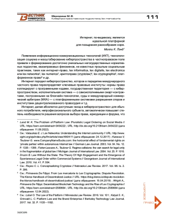 4. Мажорина М. В. Цифровые платформы и международное частное право, или есть ли будущее у киберправа? // Lex russica. - 2019. - № 2 (147).