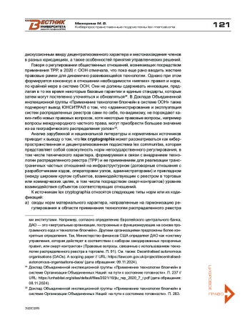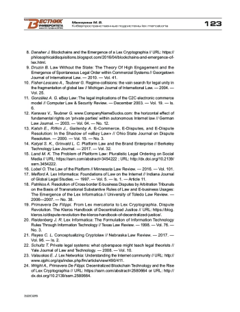 23. Wright A., Primavera De Filippi. Decentralized Blockchain Technology and the Rise of Lex Cryptographia // URL: https://ssrn.com/abstract=2580664 or URL: https://doi.org/10.2139/ssrn.2580664.