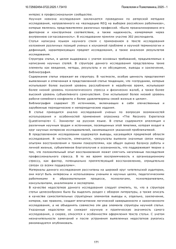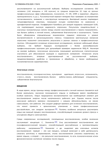 В данной статье описывается адаптация опросника «The Recovery Experience Questionnaire» С. Зоннентаг, предназначенного для оценки опытов восстановления в нерабочее время. Методика основана на теории сохранения ресурсов С. Хобфолла и модели восстановления усилий Т. Меймана. Опросник включает 16 пунктов, формирующих четыре самооценочные шкалы: психологическую отстраненность, расслабление, мастерство и контроль. На данный момент, методика адаптирована и используется в исследованиях в более чем 10 странах, однако впервые рассматривается на русскоязычной выборке. Выборка исследования составила 302 человека (162 женщины и 140 мужчин) со средним возрастом 32 года из разных профессиональных сфер (образование, психология, IT, HR, SMM и маркетинг, общепит, промышленность и д. р.). Русскоязычный вариант методики был проверен на внутреннюю согласованность, внешнюю и конструктную валидность. Факторный анализ подтвердил четырехфакторную структуру, показывая лучшее соответствие по сравнению с однофакторной моделью. Коэффициент Кронбаха для каждой подшкалы превышает 0,85, что подтверждает высокую надежность опросника. Результаты свидетельствуют о значимых положительных связях между опытом восстановления и такими показателями, как баланс работы и личной жизни, субъективное благополучие и осознанность. Также были обнаружены отрицательные взаимосвязи подшкал опросника и уровня восприимчивости к организационному стрессу. Сохранение оригинальных вопросов опросника позволяет сопоставлять результаты в разных странах и профессиональных группах. Обсуждаются основные ограничения исследования, включая небольшой объем выборки, что требует будущих исследований с более разнообразными профессиональными группами для дальнейшей проверки надежности REQ-R. Несмотря на размер выборки, полученные результаты показывают достаточную статистическую значимость для обоснования выводов о надежности измерений. «Опросник опыта восстановления», впервые адаптированный на русскоязычной выборке, продемонстрировал удобство в применении и обработке, а также необходимые психометрические характеристики.