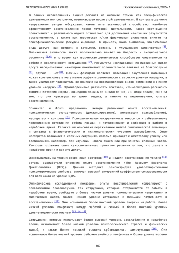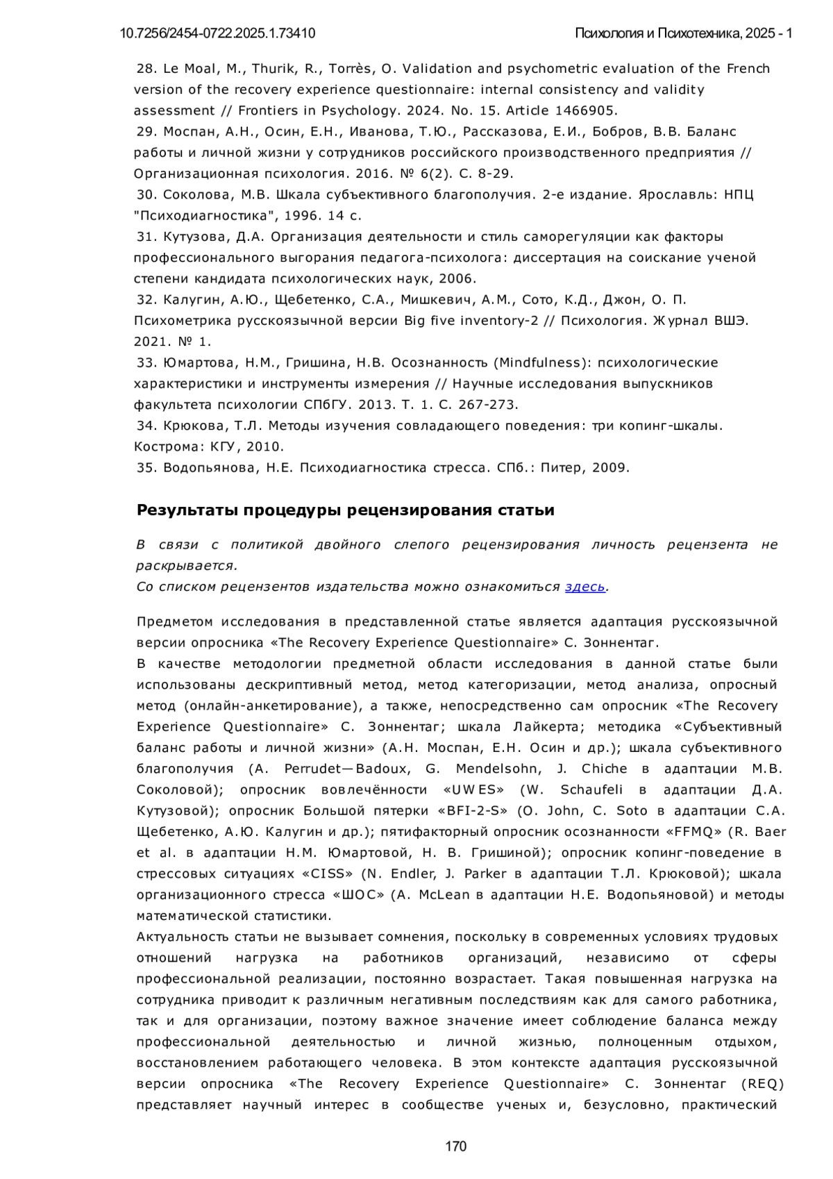 28. Le Moal, M., Thurik, R., Torrès, O. Validation and psychometric evaluation of the French version of the recovery experience questionnaire: internal consistency and validity assessment // Frontiers in Psychology. 2024. No. 15. Article 1466905.