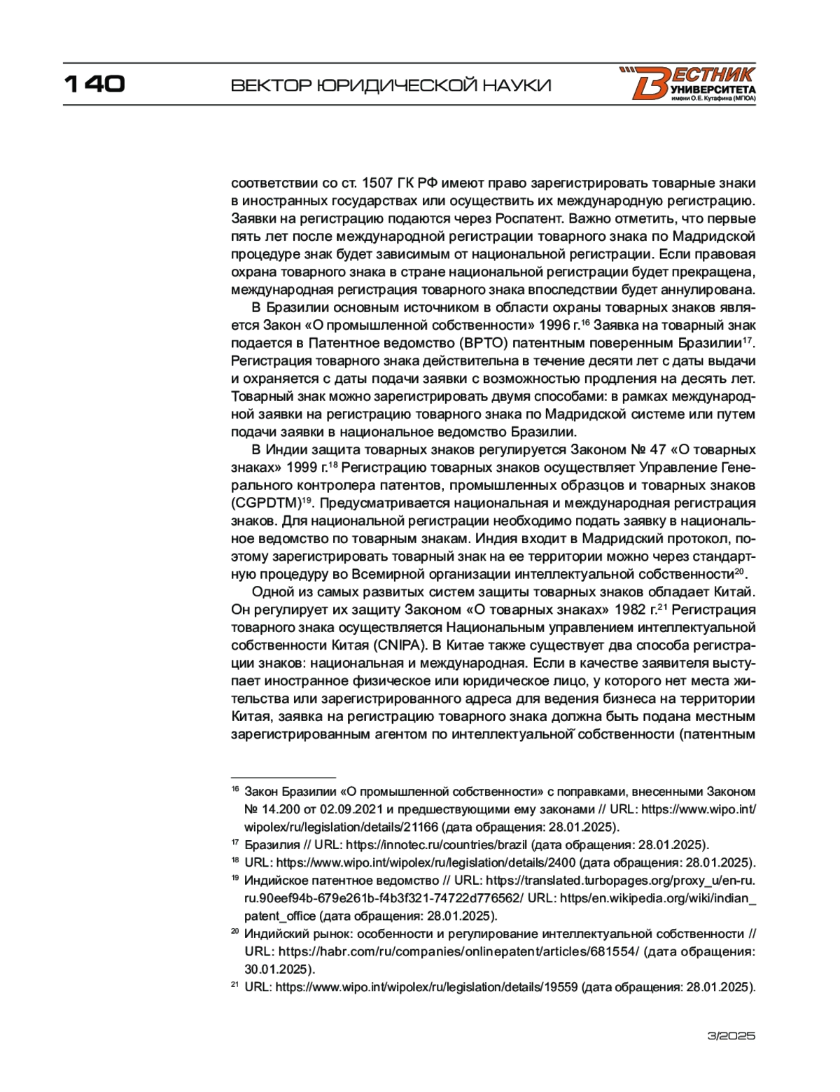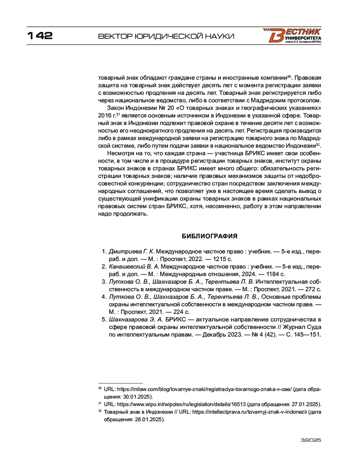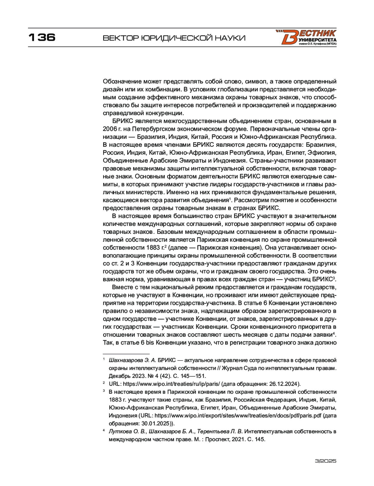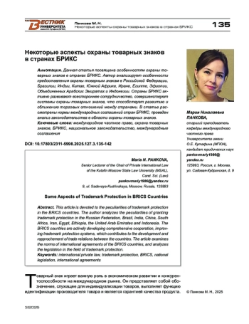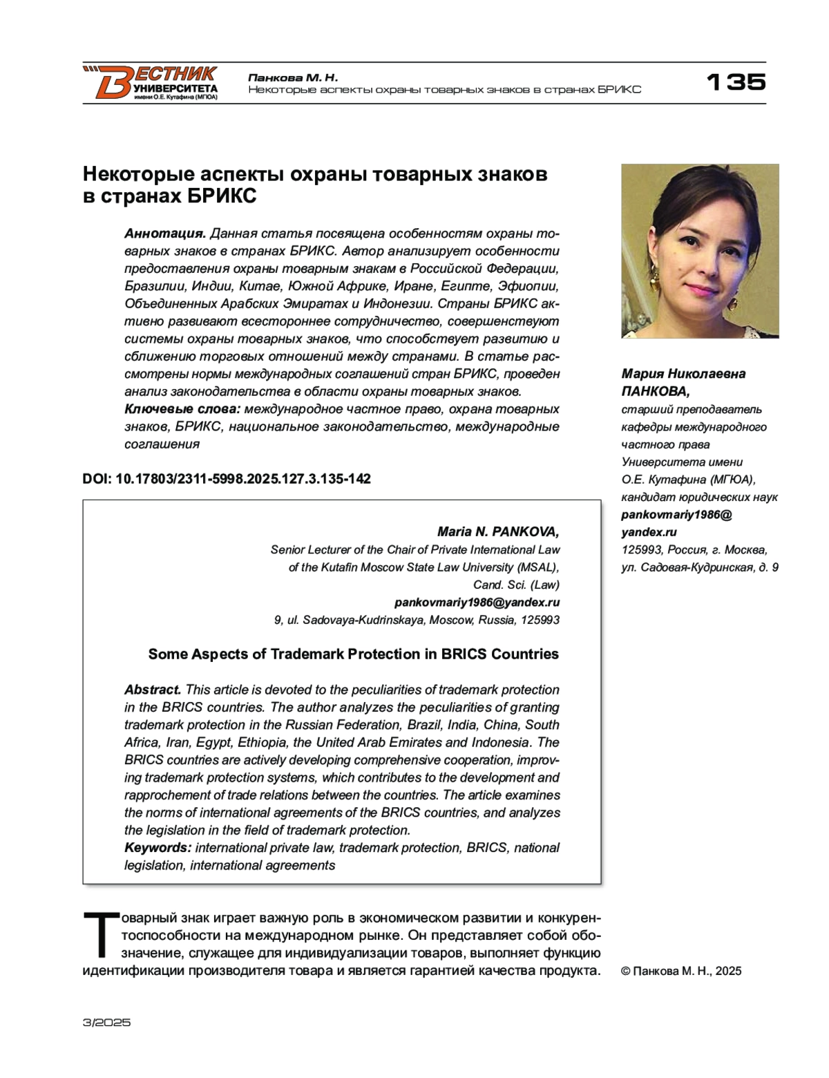 ПАНКОВА М. Н. НЕКОТОРЫЕ АСПЕКТЫ ОХРАНЫ ТОВАРНЫХ ЗНАКОВ В СТРАНАХ БРИКС // ВЕСТНИК УНИВЕРСИТЕТА ИМЕНИ О.Е. КУТАФИНА (МГЮА). 2025. № 3 (127)