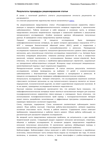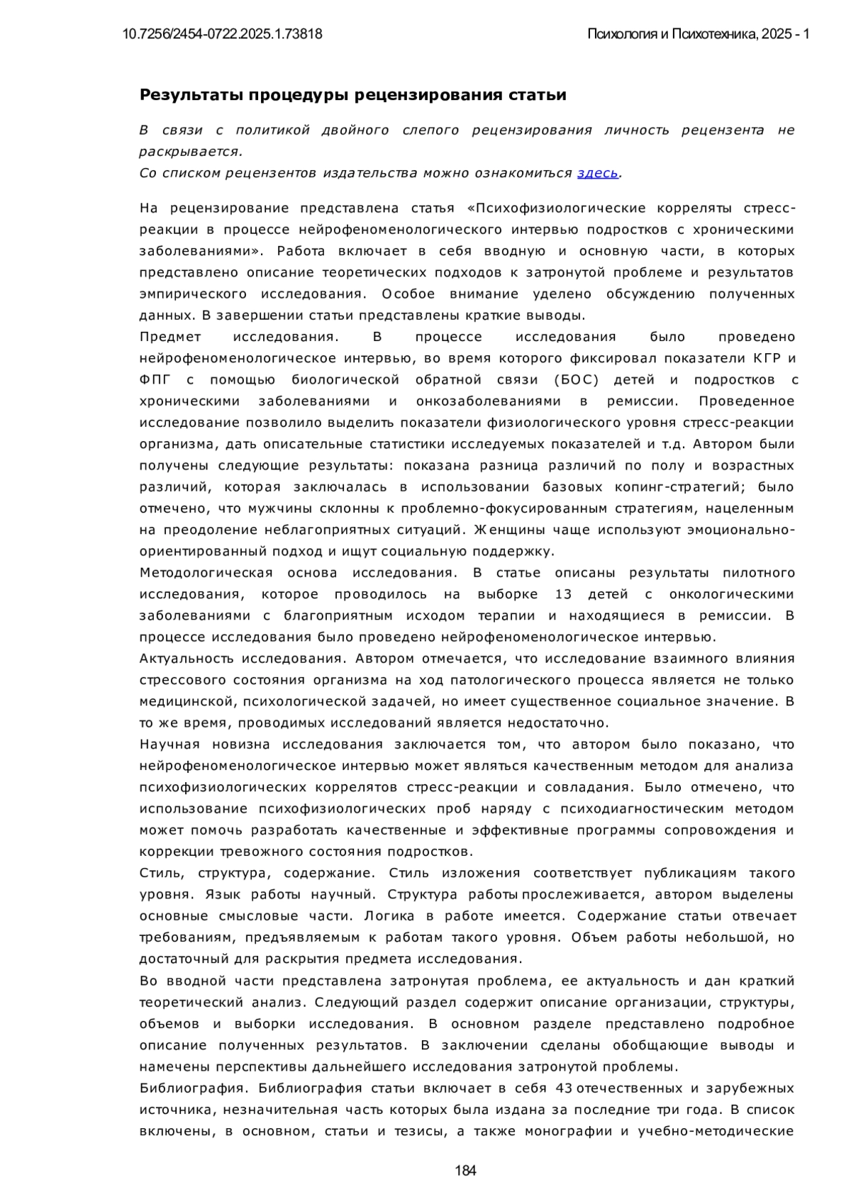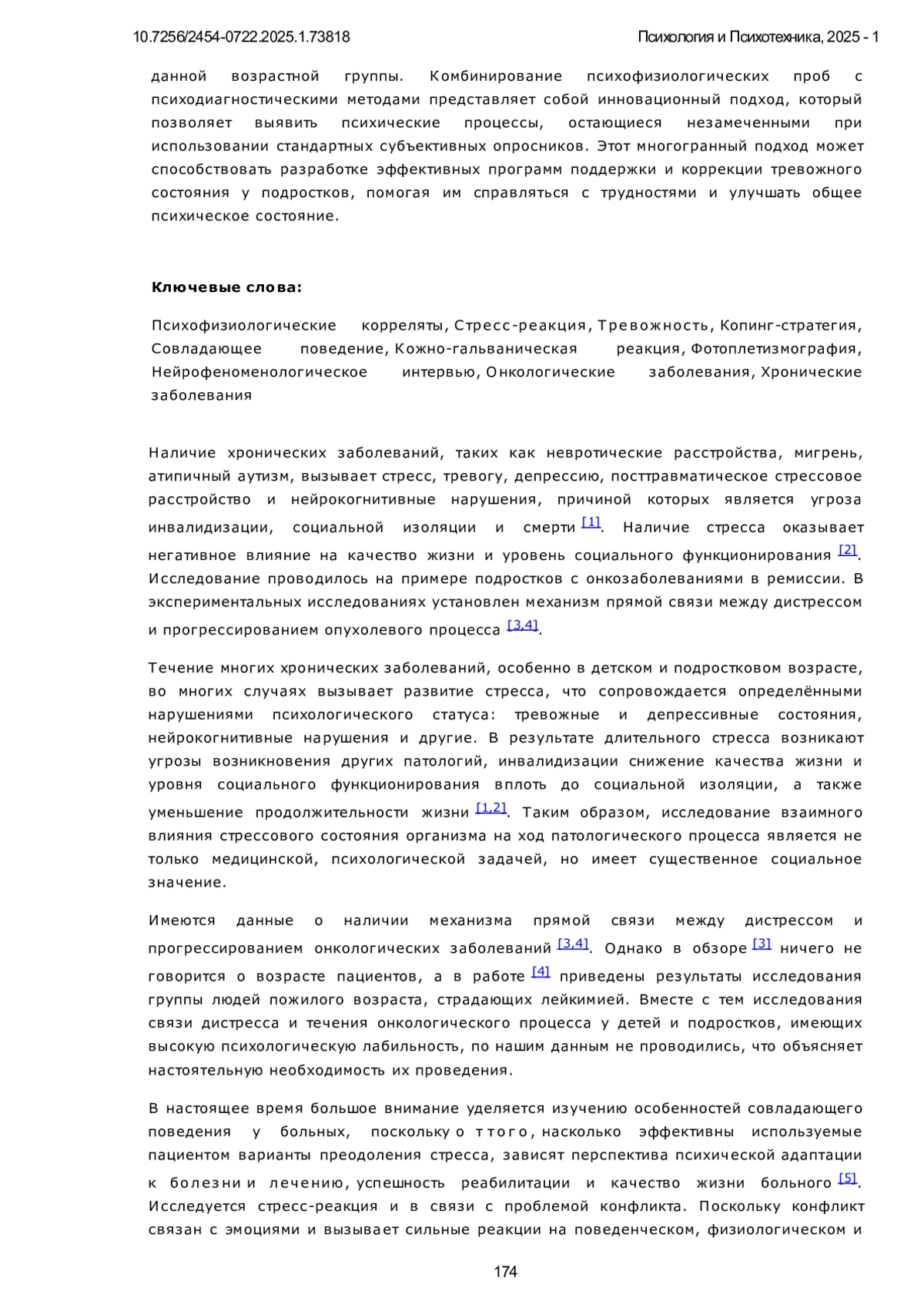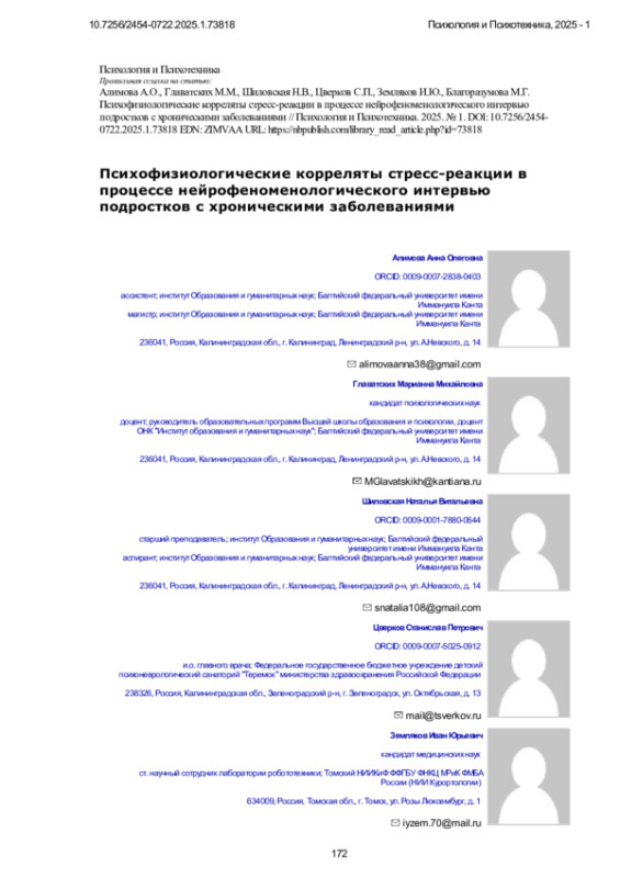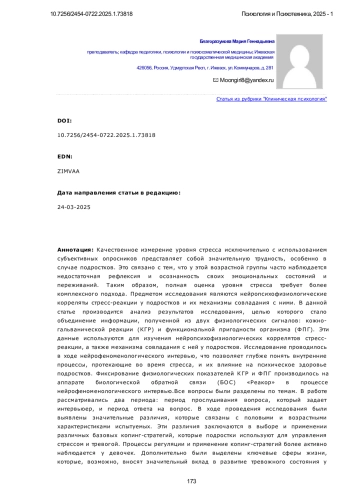 Качественное измерение уровня стресса исключительно с использованием субъективных опросников представляет собой значительную трудность, особенно в случае подростков. Это связано с тем, что у этой возрастной группы часто наблюдается недостаточная рефлексия и осознанность своих эмоциональных состояний и переживаний. Таким образом, полная оценка уровня стресса требует более комплексного подхода. Предметом исследования являются нейропсихофизиологические корреляты стресс-реакции у подростков и их механизмы совладания с ними. В данной статье производится анализ результатов исследования, целью которого стало объединение информации, полученной из двух физиологических сигналов: кожно-гальванической реакции (КГР) и функциональной пригодности организма (ФПГ). Эти данные используются для изучения нейропсихофизиологических коррелятов стресс-реакции, а также механизма совладания с ней у подростков. Исследование проводилось в ходе нейрофеноменологического интервью, что позволяет глубже понять внутренние процессы, протекающие во время стресса, и их влияние на психическое здоровье подростков. Фиксирование физиологических показателей КГР и ФПГ производилось на аппарате биологической обратной связи (БОС) «Реакор» в процессе нейрофеноменологического интервью. Все вопросы были разделены по темам. В работе рассматривались два периода: период прослушивания вопроса, который задает интервьюер, и период ответа на вопрос. В ходе проведения исследования были выявлены значительные различия, которые связаны с половыми и возрастными характеристиками испытуемых. Эти различия заключаются в выборе и применении различных базовых копинг-стратегий, которые подростки используют для управления стрессом и тревогой. Процессы регуляции и применение копинг-стратегий более активно наблюдается у девочек. Дополнительно были выделены ключевые сферы жизни, которые, возможно, вносят значительный вклад в развитие тревожного состояния у данной возрастной группы. Комбинирование психофизиологических проб с психодиагностическими методами представляет собой инновационный подход, который позволяет выявить психические процессы, остающиеся незамеченными при использовании стандартных субъективных опросников. Этот многогранный подход может способствовать разработке эффективных программ поддержки и коррекции тревожного состояния у подростков, помогая им справляться с трудностями и улучшать общее психическое состояние.