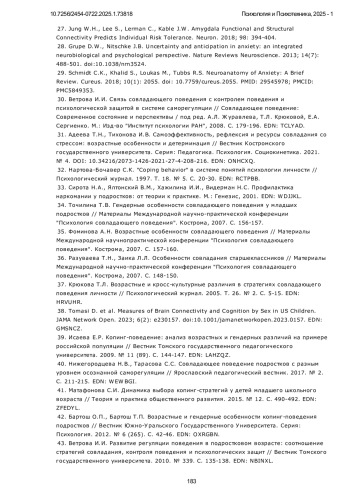 24. Бохан Т. Г., Залевский Г. В., Мещерякова Э. И. Гендерные и возрастные различия в копинг-стратегиях юношей народов Сибири // Вестник Томского государственного университета. 2005. № 286 (март): Серия “Психология”. С. 50-55.