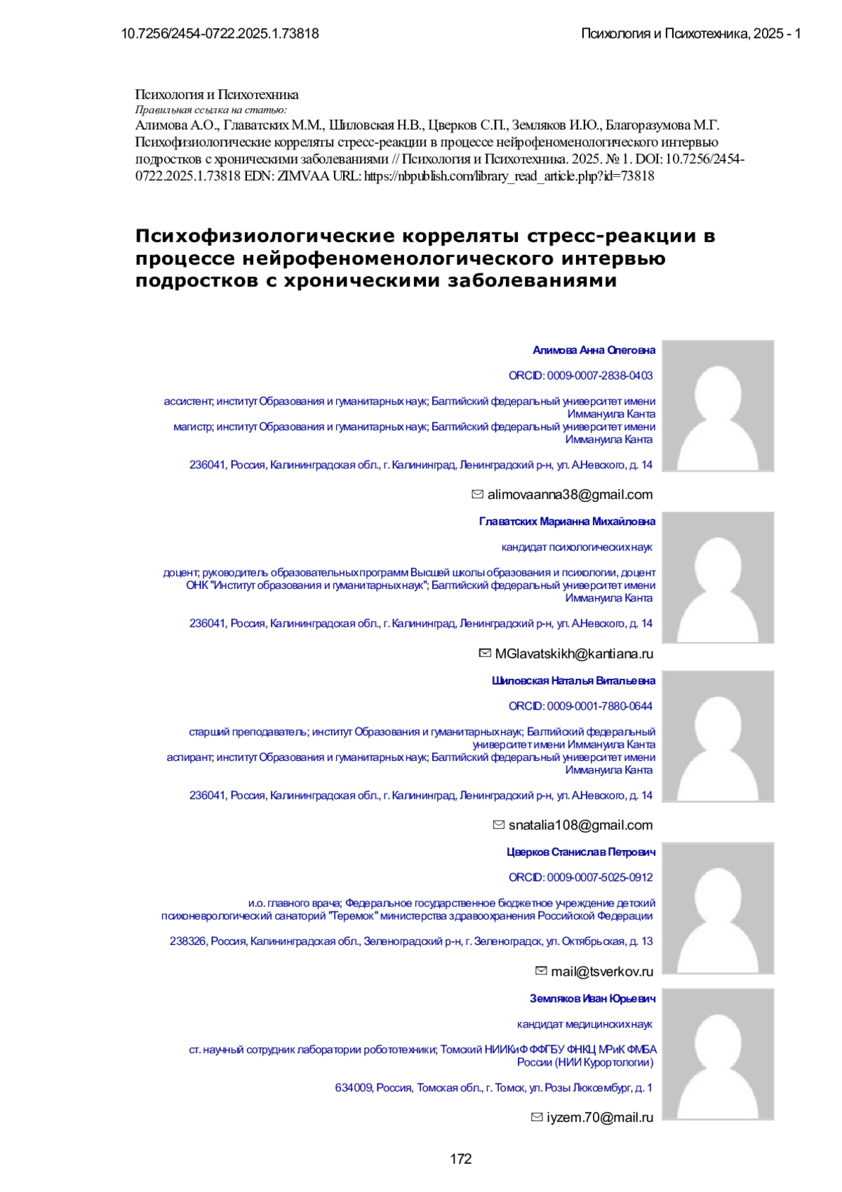 11. Костыркина В.В., Реверчук И.В., Главатских М.М., Стаценко Ф.А. Психодиагностические и электроэнцефалографические корреляты соматизации у студентов вуза в период адаптации // Психиатрия. 2025; 23(1): 61-70.