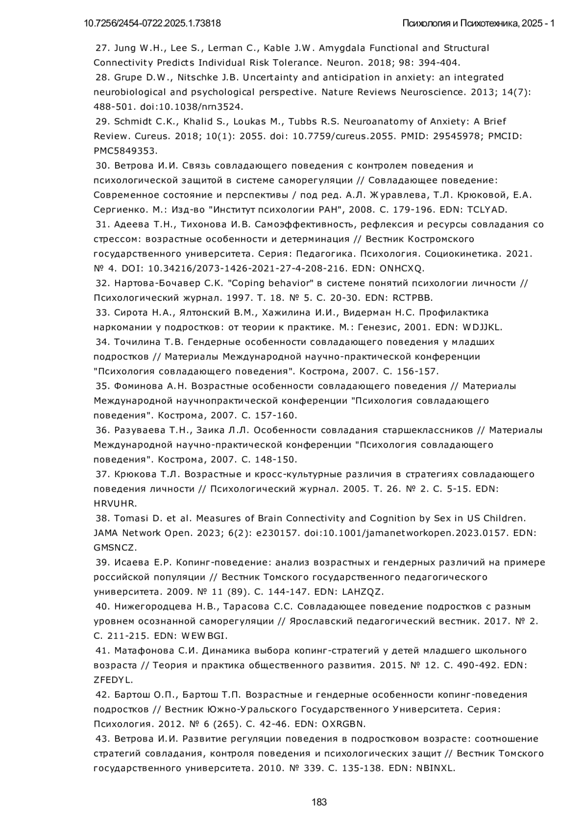 43. Ветрова И.И. Развитие регуляции поведения в подростковом возрасте: соотношение стратегий совладания, контроля поведения и психологических защит // Вестник Томского государственного университета. 2010. № 339. С. 135-138.