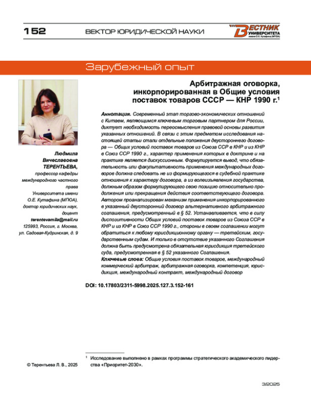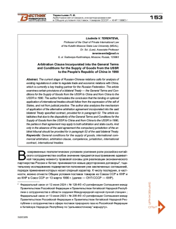 Современный этап торгово-экономических отношений с Китаем, являющимся ключевым торговым партнером для России, диктует необходимость переосмысления правовой основы развития указанных отношений. В связи с этим предметом исследования настоящей статьи стали отдельные положения двустороннего договора — Общих условий поставок товаров из Союза ССР в КНР и из КНР в Союз ССР 1990 г., характер применения которых в доктрине и на практике является дискуссионным. Формулируется вывод, что обязательность или факультативность применения международных договоров должна следовать не из формирующегося в судебной практике отношения к характеру договора, а из волеизъявления государства, должным образом формулирующего свою позицию относительно продолжения или прекращения действия соответствующего договора. Автором проанализирован механизм применения инкорпорированного в указанный двусторонний договор альтернативного арбитражного соглашения, предусмотренный в § 52. Устанавливается, что в силу диспозитивности Общих условий поставок товаров из Союза ССР в КНР и из КНР в Союз ССР 1990 г., стороны в своем соглашении могут обратиться к любому юрисдикционному органу — третейским, государственным судам. И только в отсутствие указанного Соглашения должна быть предусмотрена обязательная юрисдикция третейского суда, предусмотренная в § 52 указанного Соглашения.