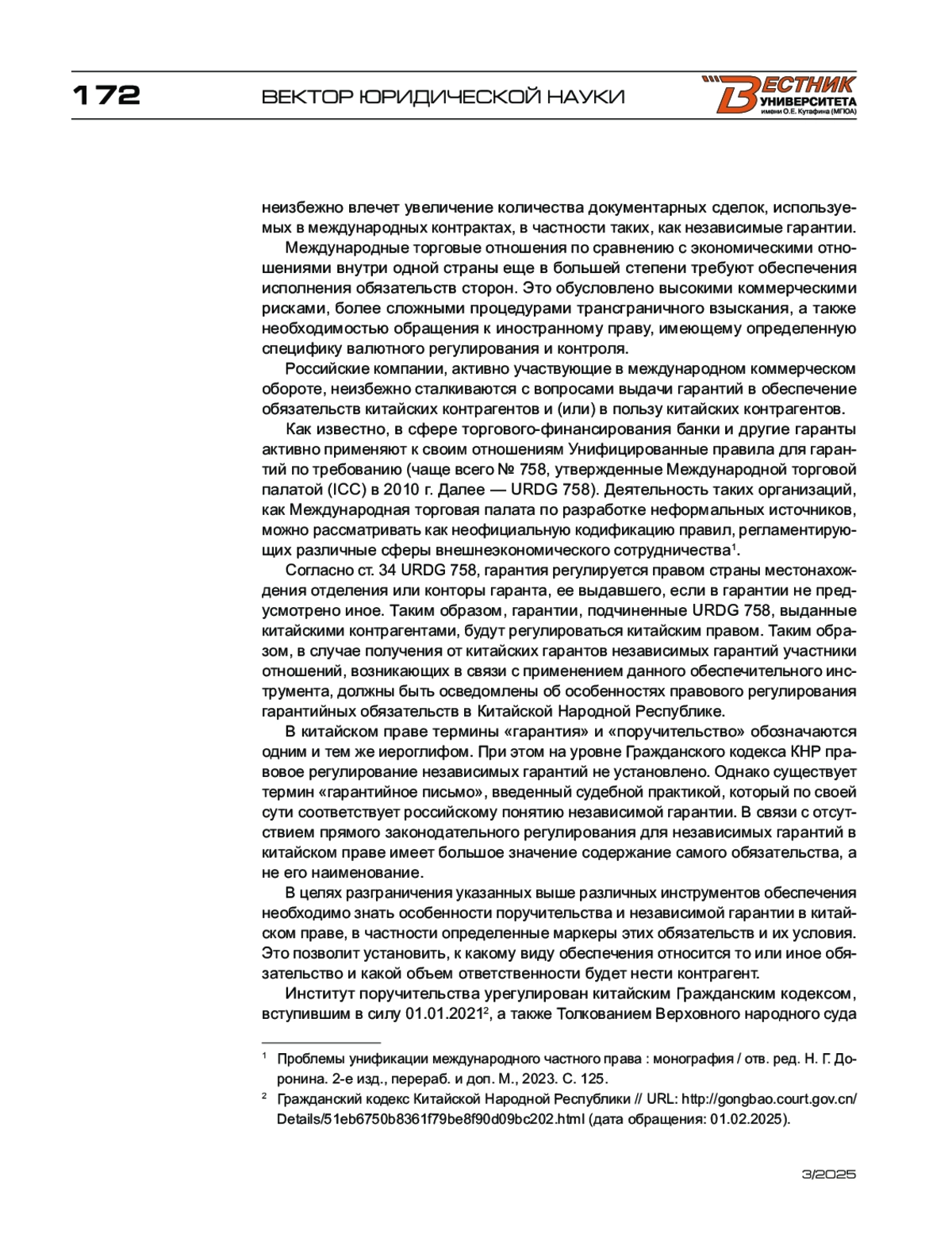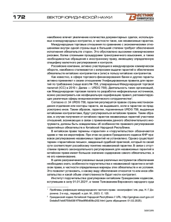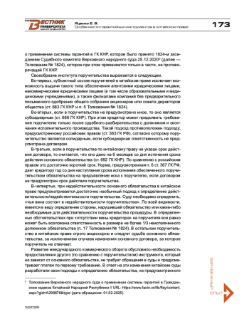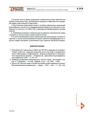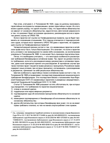 Развитие международных торговых отношений между Российской Федерацией и Китайской Народной Республикой повлекло увеличение количества трансграничных документарных сделок, значимое место среди которых занимают гарантии. На основе анализа нормативных актов и судебных комментариев Китая и России автором проводится правовое исследование гарантийных обязательств. В статье выявлены существенные отличия в правовом регулировании гарантий и поручительства в российском и китайском праве, а также даны рекомендации при структурировании гарантийных сделок с участием китайских контрагентов.