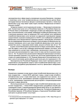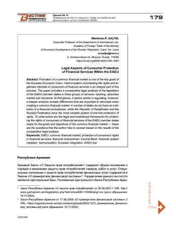 Одна из ключевых задач Евразийского экономического союза — формирование общего финансового рынка. Гармонизация в сфере защиты прав и законных интересов потребителей финансовых услуг является составным элементом данного процесса. В работе проведен сравнительно-правовой анализ законодательства государств — членов ЕАЭС по трем группам услуг: банковские, рынок ценных бумаг и страхование. Ключевой элемент сравнения — институциональная основа. На первый взгляд можно увидеть сходные подходы к регулированию данной сферы отношений, однако более глубокий анализ показывает и отличия, которые важно устранить при создании общего финансового рынка. В ряде государств отсутствует институт финансового омбудсмена, тогда как в Республике Казахстан и Российской Федерации действует наиболее вариативная система защиты прав в досудебном порядке. Насколько правовая и институциональная основы в части защиты прав потребителей финансовых услуг государств — членов ЕАЭС готовы к целям и задачам общего финансового рынка — те вопросы, на которые автор пытается дать ответ по результатам сравнительно-правового анализа.