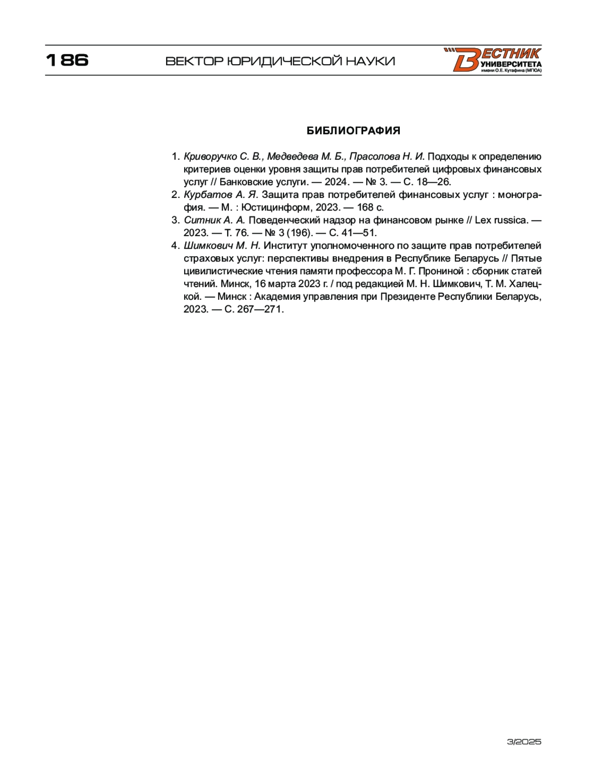 1. Криворучко С. В., Медведева М. Б., Прасолова Н. И. Подходы к определению критериев оценки уровня защиты прав потребителей цифровых финансовых услуг // Банковские услуги. - 2024. - № 3. - С. 18-26.