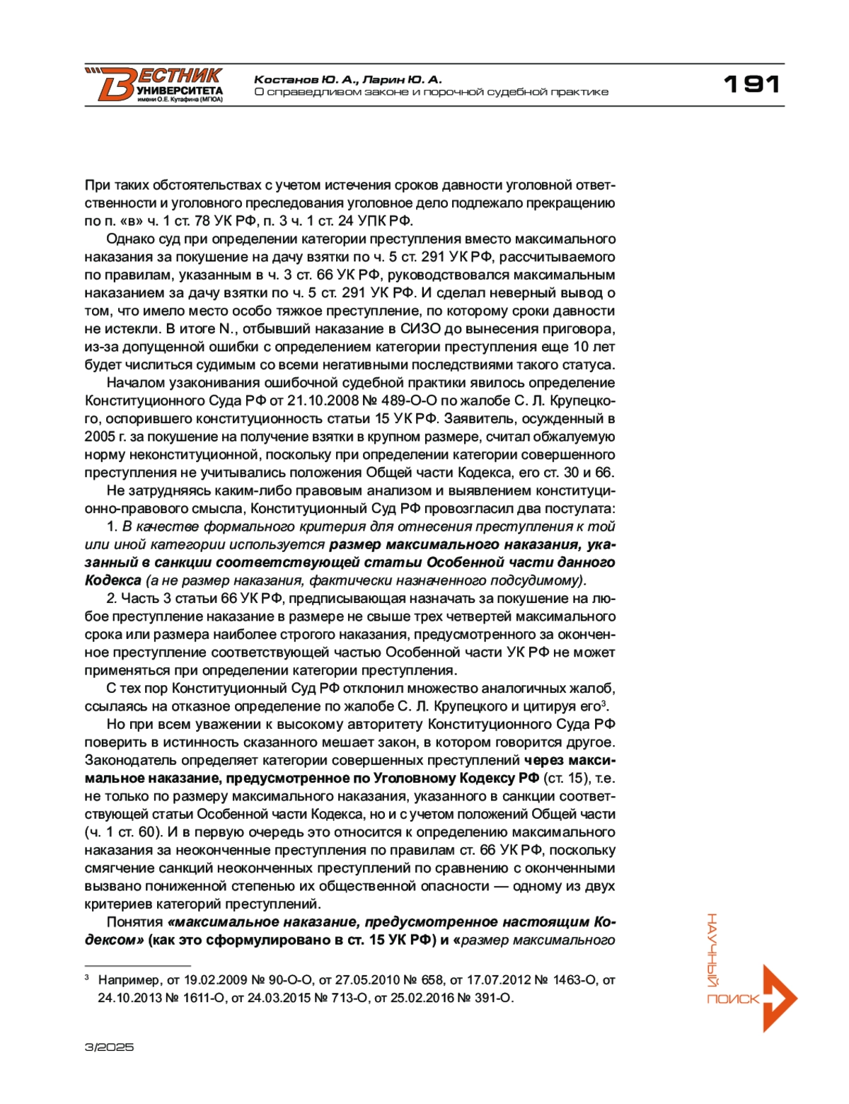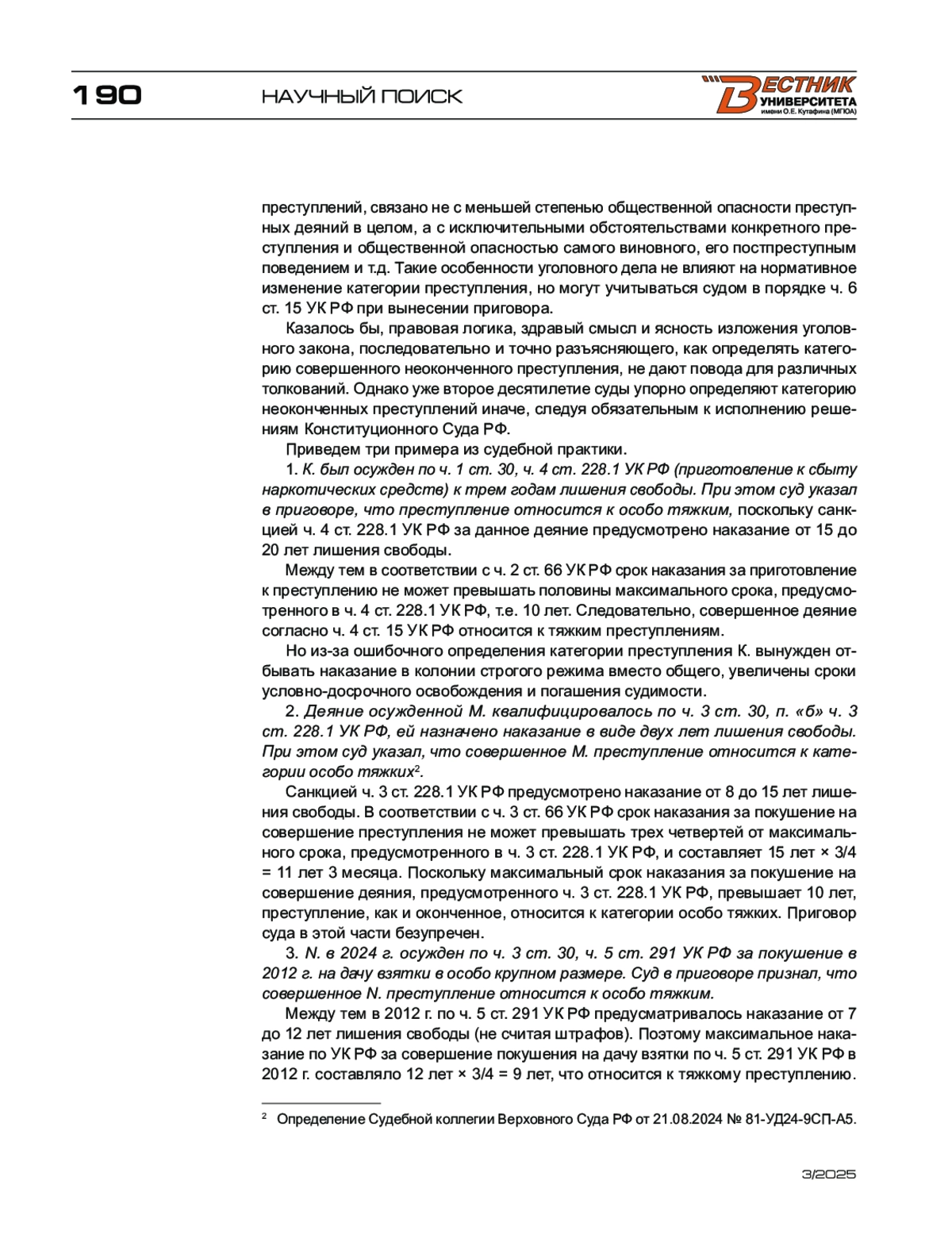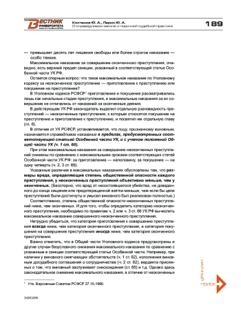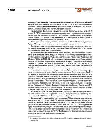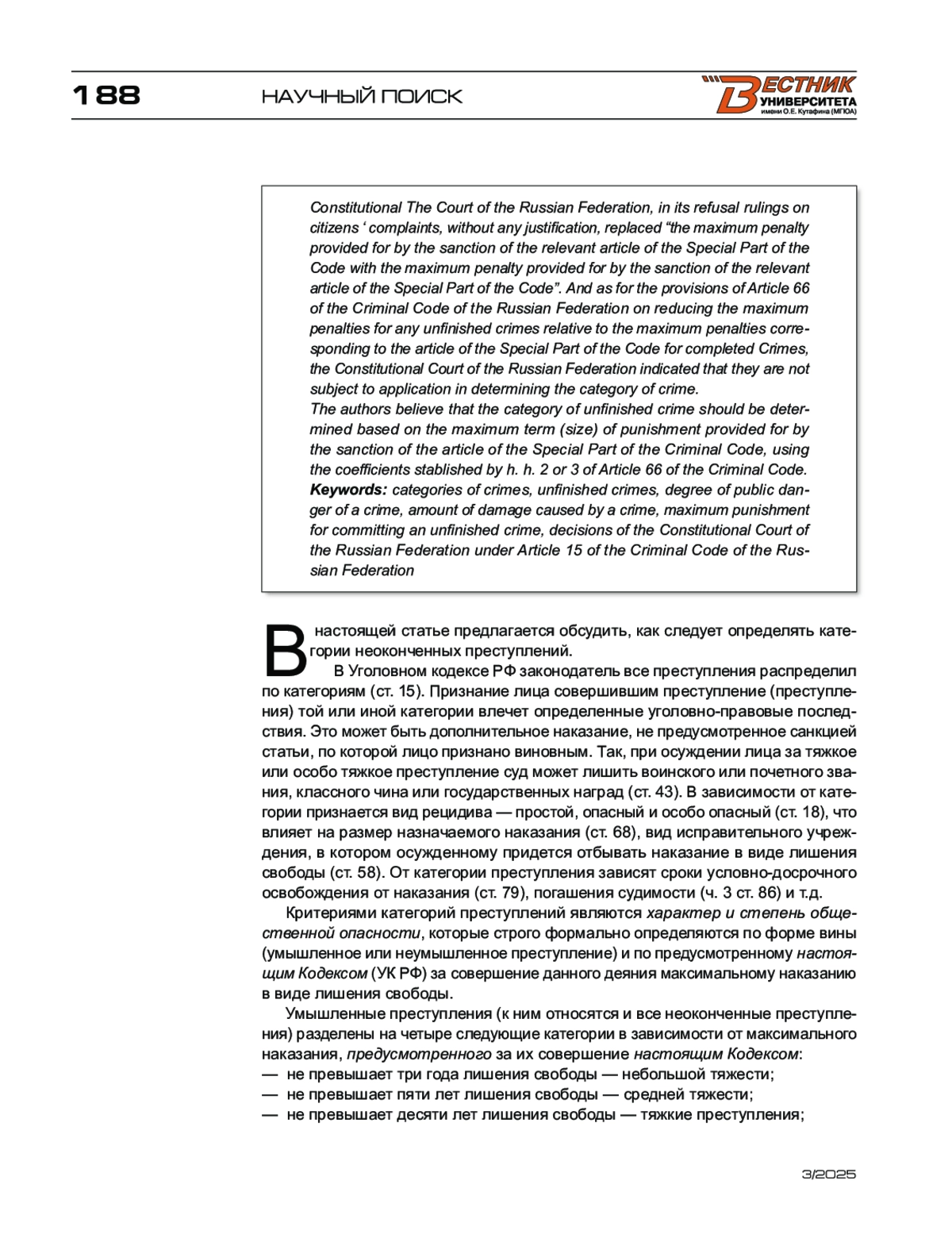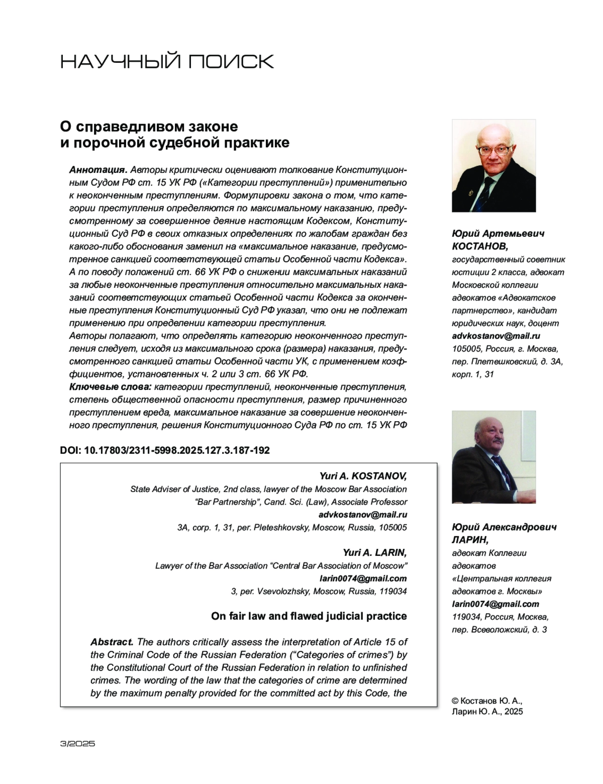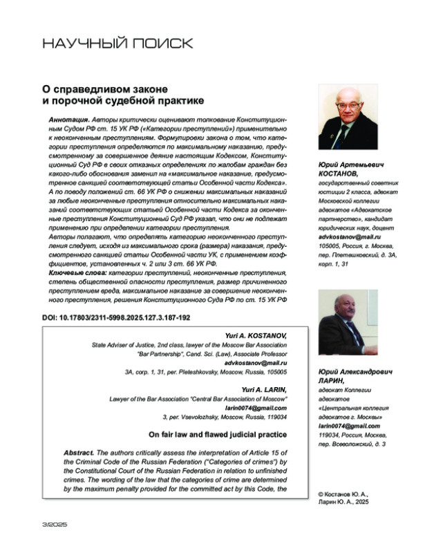 Автор критически оценивает толкование Конституционным Судом РФ ст. 15 УК РФ («Категории преступлений») применительно к неоконченным преступлениям. Формулировки закона о том, что категории преступления определяются по максимальному наказанию, предусмотренному за совершенное деяние настоящим Кодексом, Конституционный Суд РФ в своих отказных определениях по жалобам граждан без какого-либо обоснования заменил на «максимальное наказание, предусмотренное санкцией соответствующей статьи Особенной части Кодекса». А по поводу положений ст. 66 УК РФ о снижении максимальных наказаний за любые неоконченные преступления относительно максимальных наказаний соответствующих статьей Особенной части Кодекса за оконченные преступления Конституционный Суд РФ указал, что они не подлежат применению при определении категории преступления. Автор полагает, что определять категорию неоконченного преступления следует, исходя из максимального срока (размера) наказания, предусмотренного санкцией статьи Особенной части УК, с применением коэффициентов, установленных ч. 2 или 3 ст. 66 УК РФ.