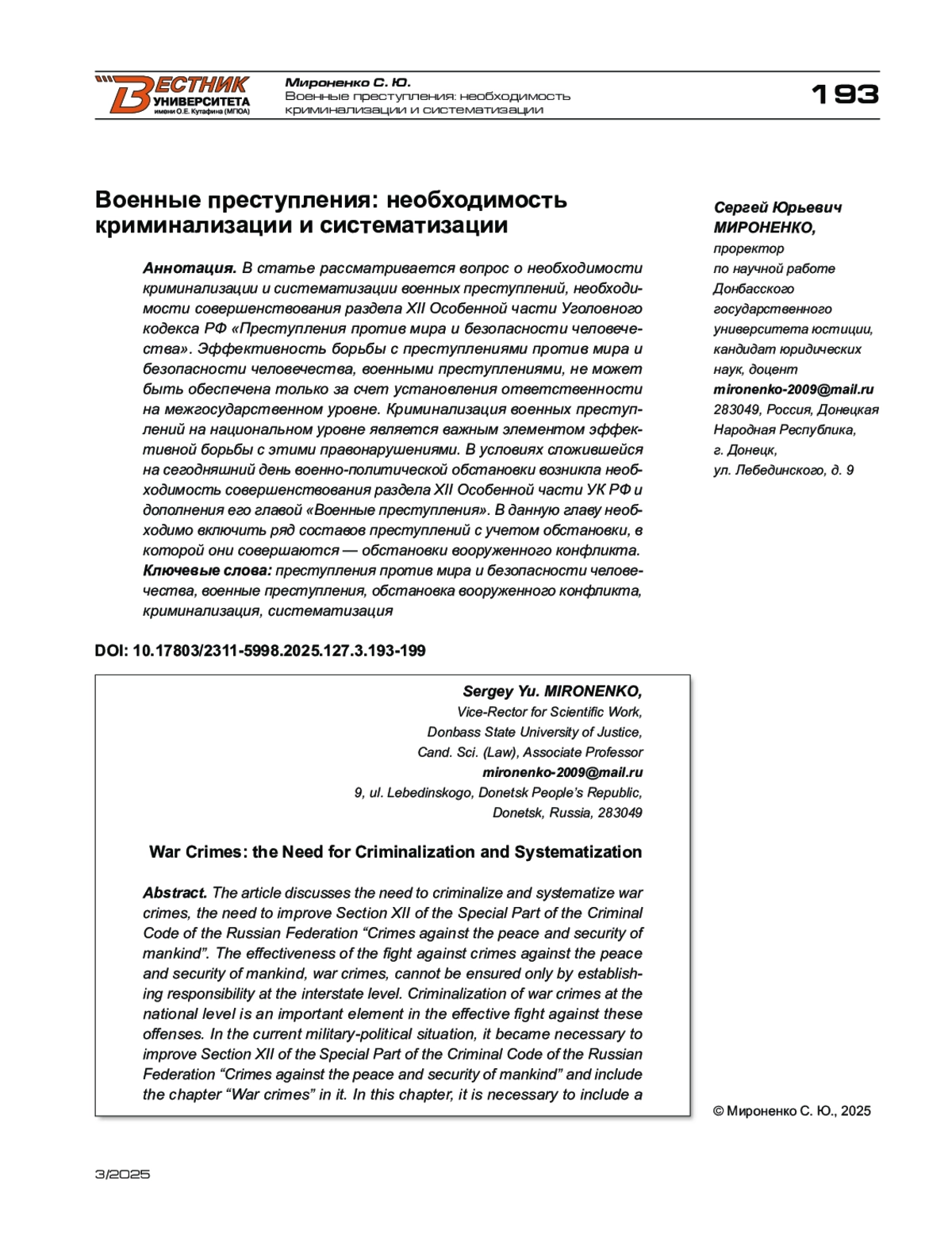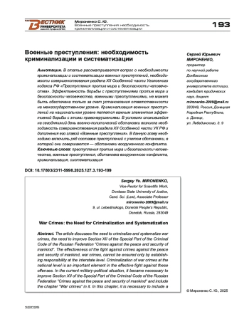В статье рассматривается вопрос о необходимости криминализации и систематизации военных преступлений, необходимости совершенствования раздела XII Особенной части Уголовного кодекса РФ «Преступления против мира и безопасности человечества». Эффективность борьбы с преступлениями против мира и безопасности человечества, военными преступлениями, не может быть обеспечена только за счет установления ответственности на межгосударственном уровне. Криминализация военных преступлений на национальном уровне является важным элементом эффективной борьбы с этими правонарушениями. В условиях сложившейся на сегодняшний день военно-политической обстановки возникла необходимость совершенствования раздела XII Особенной части УК РФ и дополнения его главой «Военные преступления». В данную главу необходимо включить ряд составов преступлений с учетом обстановки, в которой они совершаются — обстановки вооруженного конфликта.
