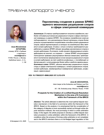 В статье предпринимается попытка определить наиболее оптимальный механизм разрешения споров в сфере электронной коммерции в рамках БРИКС. На основании проведенного анализа подчеркивается, что рассмотрение данной категории споров более успешно осуществляется посредством способов онлайн-разрешения споров, самым перспективным из которых на сегодняшний день является онлайн-арбитраж. В связи с этим в статье предлагается разработать в рамках БРИКС единую процедуру рассмотрения споров в онлайн-арбитраже. В условиях, когда процесс формирования онлайн-арбитража не окончен, а в странах — членах БРИКС отсутствует полноценное правовое регулирование данного механизма, предлагается постепенное формирование основ процесса разрешения споров в онлайн-арбитраже за счет средств унификации, с последующей их детализацией с использованием более гибких средств гармонизации.