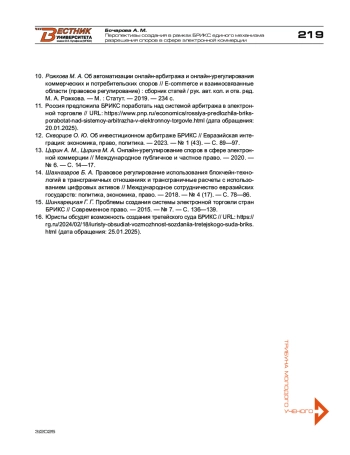 11. Россия предложила БРИКС поработать над системой арбитража в электронной торговле // URL: https://www.pnp.ru/economics/rossiya-predlozhila-briksporabotat-nad-sistemoy-arbitrazha-v-elektronnoy-torgovle.html (дата обращения: 20.01.2025).