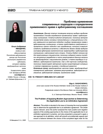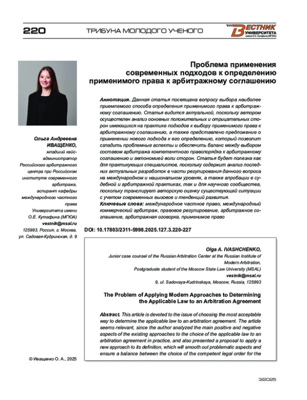 Данная статья посвящена вопросу выбора наиболее приемлемого способа определения применимого права к арбитражному соглашению. Статья видится актуальной, поскольку автором осуществлен анализ основных положительных и отрицательных сторон имеющихся на практике подходов к выбору применимого права к арбитражному соглашению, а также представлено предложение о применении нового подхода к его определению, который позволит сгладить проблемные аспекты и обеспечить баланс между выбором составом арбитража компетентного правопорядка к арбитражному соглашению и автономией воли сторон. Статья будет полезна как для практикующих специалистов, поскольку содержит анализ последних актуальных разработок в части регулирования данного вопроса на международном и национальном уровнях, а также апробации в судебной и арбитражной практиках, так и для научного сообщества, поскольку транслирует авторскую оценку существующей ситуации с учетом современных вызовов и тенденций развития.