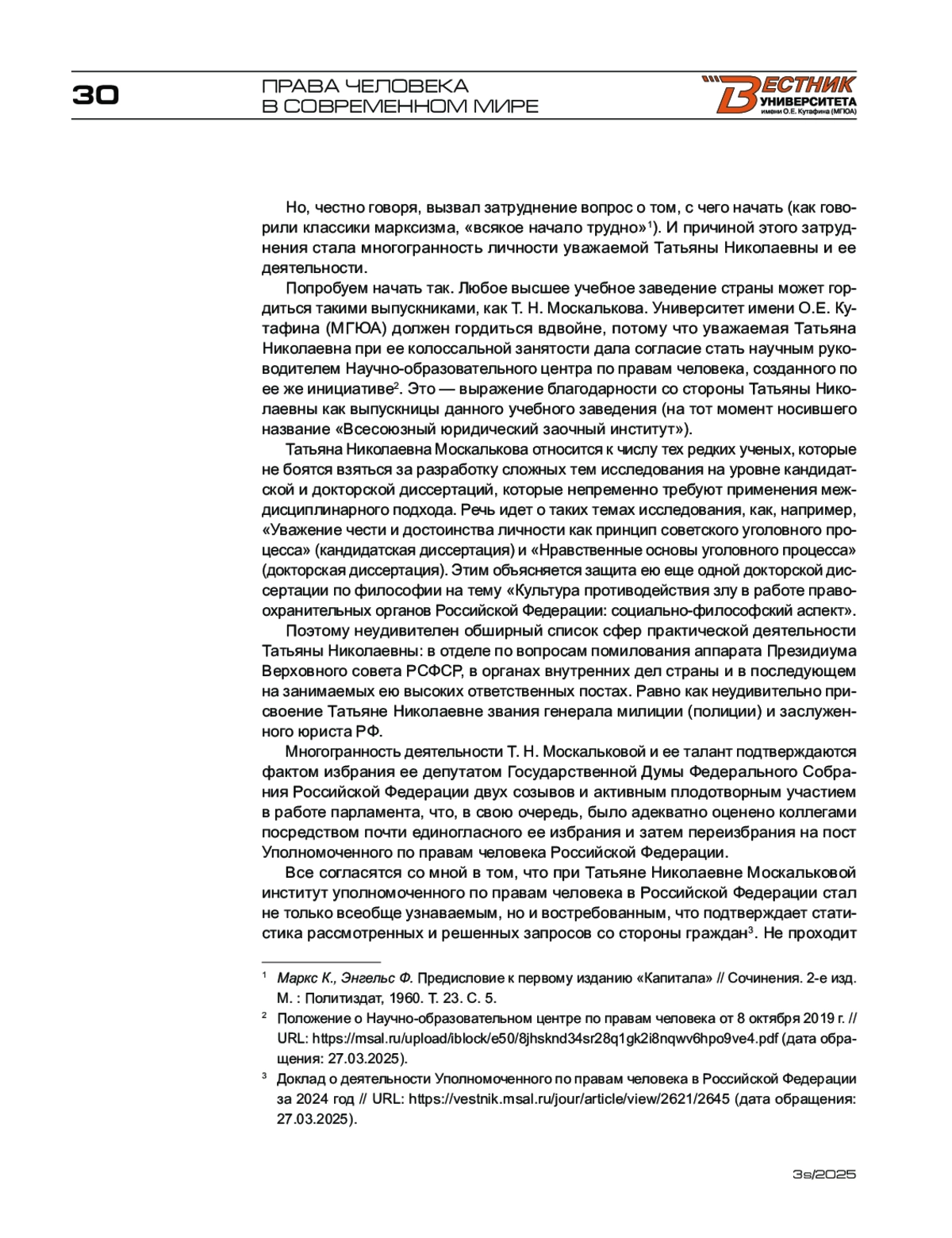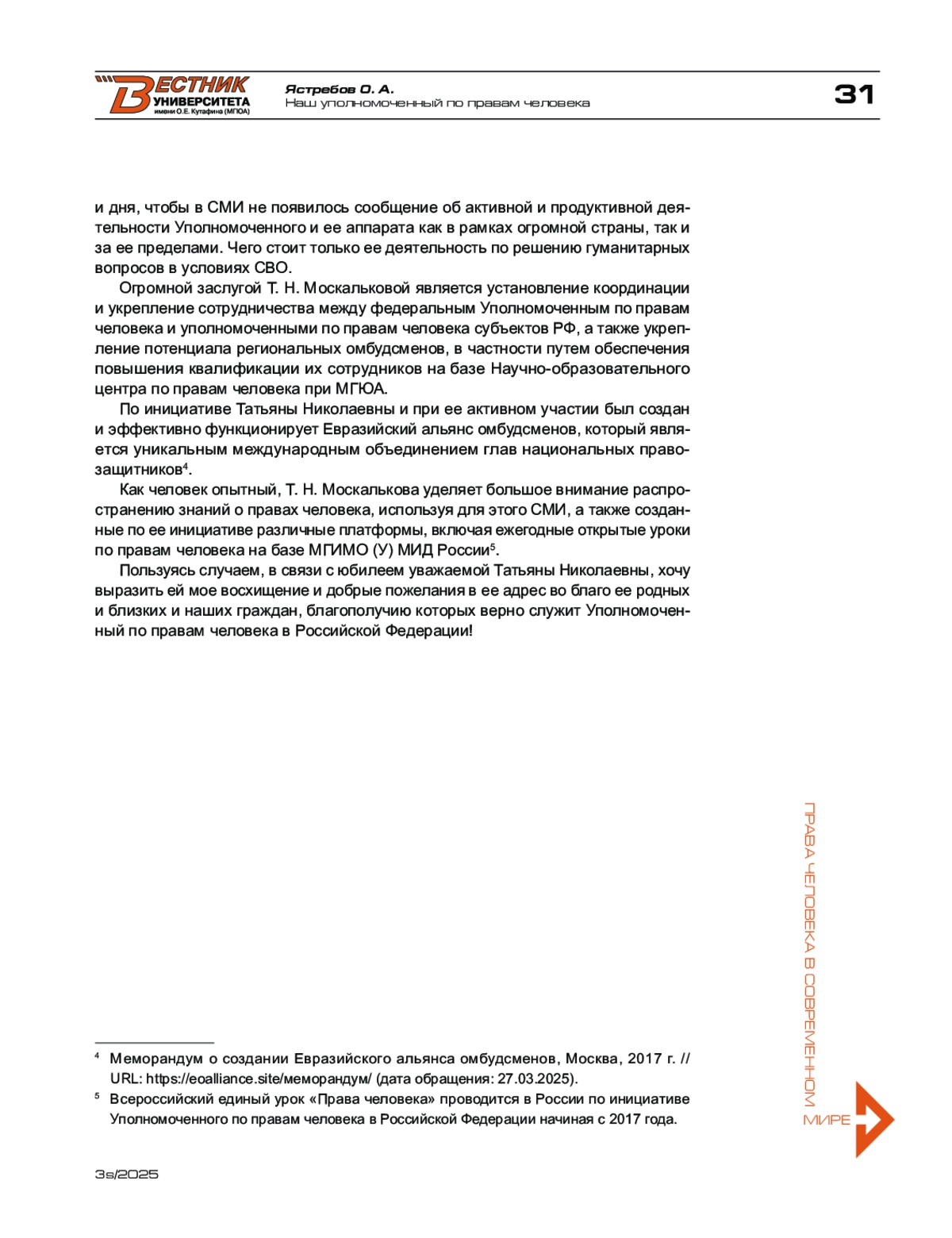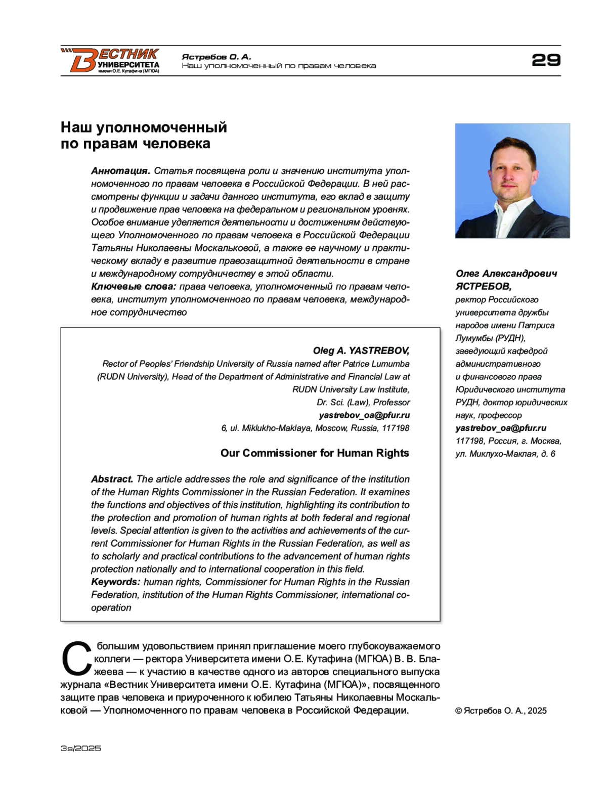 ЯСТРЕБОВ О. А. НАШ УПОЛНОМОЧЕННЫЙ ПО ПРАВАМ ЧЕЛОВЕКА // ВЕСТНИК УНИВЕРСИТЕТА ИМЕНИ О.Е. КУТАФИНА (МГЮА). 2025. № 3S