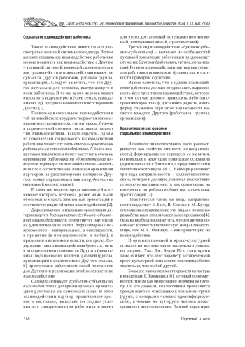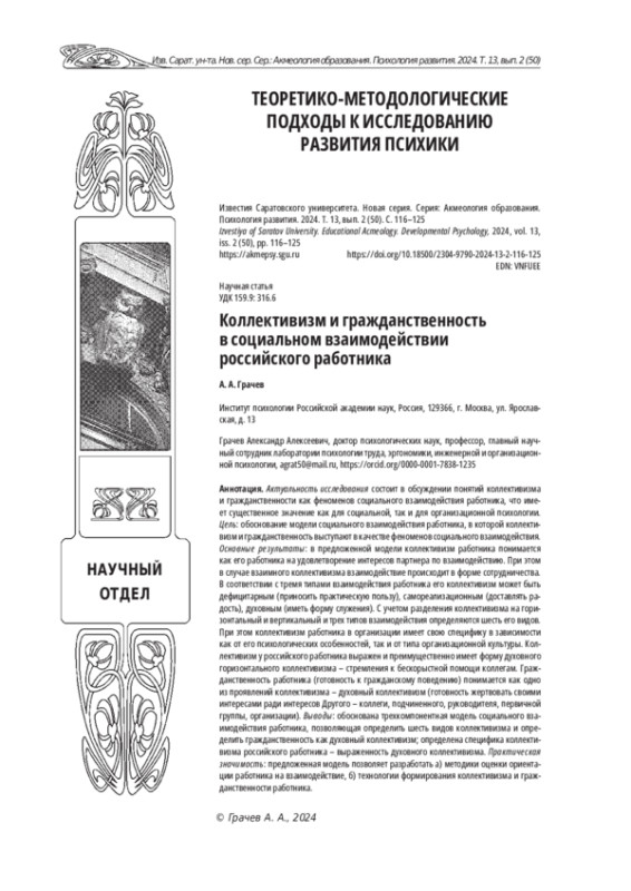 Цель: обоснование модели социального взаимодействия работника, в которой коллективизм и гражданственность выступают в качестве феноменов социального взаимодействия. Основные результаты: в предложенной модели коллективизм работника понимается как его работника на удовлетворение интересов партнера по взаимодействию. При этом в случае взаимного коллективизма взаимодействие происходит в форме сотрудничества. В соответствии с тремя типами взаимодействия работника его коллективизм может быть дефицитарным (приносить практическую пользу), самореализационным (доставлять радость), духовным (иметь форму служения). С учетом разделения коллективизма на горизонтальный и вертикальный и трех типов взаимодействия определяются шесть его видов. При этом коллективизм работника в организации имеет свою специфику в зависимости как от его психологических особенностей, так и от типа организационной культуры. Коллективизм у российского работника выражен и преимущественно имеет форму духовного горизонтального коллективизма - стремления к бескорыстной помощи коллегам. Гражданственность работника (готовность к гражданскому поведению) понимается как одно из проявлений коллективизма - духовный коллективизм (готовность жертвовать своими интересами ради интересов Другого - коллеги, подчиненного, руководителя, первичной группы, организации).