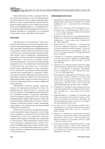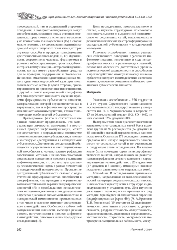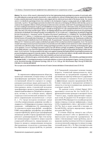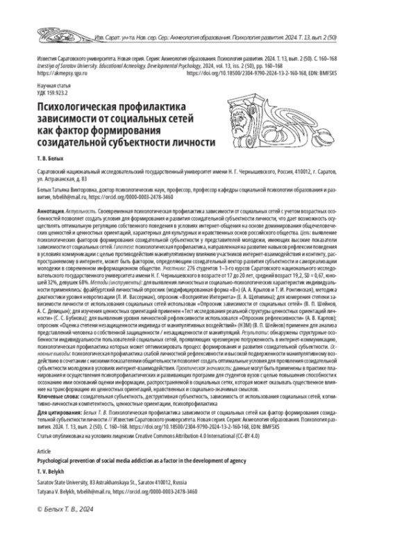 Цель: выявление психологических факторов формирования созидательной субъектности у представителей молодежи, имеющих высокие показатели зависимости от социальных сетей. Гипотеза: психологическая профилактика, направленная на развитие навыков рефлексии поведения в условиях коммуникации с целью противодействия манипулятивному влиянию участников интернет-взаимодействия и контенту, распространяемому в интернете, может быть фактором, определяющим созидательный вектор развития субъектности и самореализации молодежи в современном информационном обществе. Участники: 276 студентов 1-3-го курсов Саратовского национального исследовательского государственного университета имени Н. Г. Чернышевского в возрасте от 17 до 20 лет, средний возраст 19,2, SD = 0,67, юношей 32%, девушек 68%. Методы (инструменты): для выявления личностных и социально-психологических характеристик индивидуальности применялись: фрайбургский личностный опросник (модифицированная форма «В») (А. А. Крылов и Т. И. Ронгинская), методика диагностики уровня невротизации (Л. И. Вассерман), опросник «Восприятие Интернета» (Е. А. Щепилина); для измерения степени зависимости личности от использования социальных сетей использован «Опросник зависимости от социальных сетей» (В. П. Шейнов, А. С. Девицын); для изучения ценностных ориентаций применен «Тест исследования реальной структуры ценностных ориентаций личности» (С. С. Бубнова); для выявления уровня личностной рефлексивности использовался «Опросник рефлексивности» (А. В. Карпов); опросник «Оценка степени незащищенности индивида от манипулятивных воздействий» (НЗМ) (В. П. Шейнов) применен для анализа представлений человека о собственной защищенности / незащищенности от манипуляций.