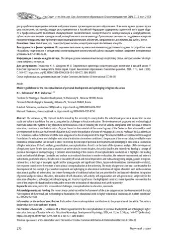 Результаты: благодаря анализу динамики разработки регулирующих оснований для практик воспитания студентов высшей школы последних десятилетий обоснована необходимость разработки концепции воспитания; представлено понимание сущности концептуализации в воспитании; выделены ведущие социокультурные вызовы (неустойчивые и нечеткие социокультурные установки современного образования, сетевая среда и сетевые субкультуры, молодежные субкультуры, отсутствие или неустойчивость социальных и моральных императивов и правил у молодежи, разрыв межпоколенческих связей, дефицит значимых для молодых людей примеров и значимых Других, гипериндивидуализация, коммуникативные дефициты), реагирование на которые задает векторы концептуализации воспитания в вузе; представлены базовые концепты для разработки концепции воспитания в образовательных организациях высшего образования. В их числе единая для всех вузов цель воспитания, системообразующая роль приоритетных в Российской Федерации традиционных ценностей, интеграция общего и профессионального воспитания, стимулирование самовоспитания, самодеятельности, самоорганизации и самоуправления, субъектность в воспитании преподавателей, полисубъектность воспитания и др. Практическая значимость: выделенные концепты позволяют определить ядро проектируемых концепций воспитания, обеспечить направленность воспитательной работы в вузе.