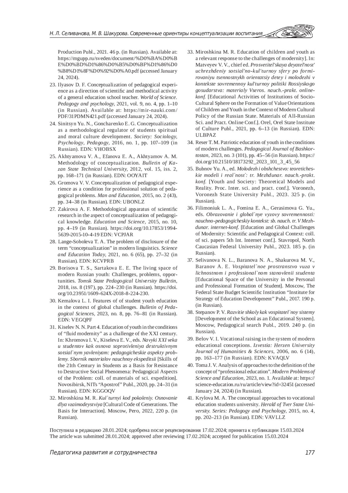 23. Ильясов Д. Ф. Концептуализация педагогического опыта как направление научно-методической деятельности педагога общеобразовательной школы // Мир науки. Педагогика и психология. 2021. Т. 9, № 4. С. 1-10. URL: https://mir-nauki.com/PDF/31PDMN421. pdf (дата обращения: 24.01.2024). EDN: MSYXWC