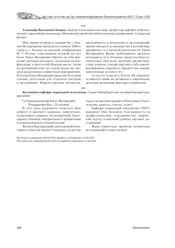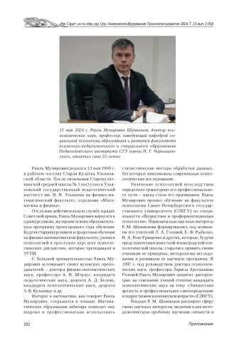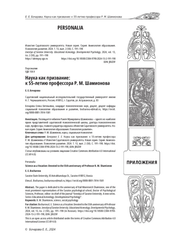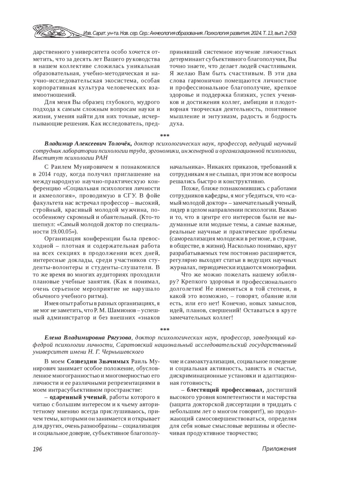Посвящается юбилею Раиля Мунировича Шамионова – одного из наиболее ярких представителей саратовской психологической школы, доктора психологических наук, профессора, главного редактора журнала «Известия Саратовского университета. Новая серия. Серия: Акмеология образования. Психология развития».