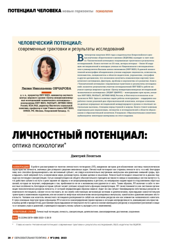 В работе рассматривается понятие личностного потенциала (ЛП), введенное автором для обозначения системы психологических характеристик личности, значимых для успешного решения жизненных задач. Личностный потенциал как стержень личности есть то в ней, благодаря чему она способна функционировать как автономный субъект, не следуя исключительно внутренним импульсам или давлению внешней среды, прокладывать свой непрямой путь в изменчивом мире, руководствуясь своими целями и смыслами. Личностный потенциал осмысляется в данном подходе как потенциал саморегуляции. Сутью саморегуляции как общего объяснительного принципа активности живых и квазиживых систем является то, что действия субъекта на пути к цели заранее не заданы и не запрограммированы в деталях, но непрерывно корректируются под влиянием обратных связей, которые он получает, информации о том, приближается ли он к желаемому или удаляется от него. Таким образом, ЛП включает в себя те личностные особенности, благодаря которым субъект может успешно осуществлять функции саморегуляции. ЛП также понимается как системная организация психологических ресурсов личности, от которой определяющим образом зависит, будет ли сам субъект бенефициаром собственных ресурсов человеческого потенциала, сможет ли он поставить их на службу собственным автономным мотивам и целеполаганию, прокладывая самостоятельную траекторию в изменчивом окружении, или же окажется инертным исполнителем неконтролируемых импульсов, чужой воли и давления внешних обстоятельств. Человек как носитель личностного потенциала распоряжается собой как носителем ресурсов или как элементом человеческого капитала. К трем основным подструктурам и функциям ЛП относятся самоопределение (ориентировка в ситуации неопределенности, взвешивание альтернатив и выбор целей и приоритетов), достижение (прокладывание оптимального пути к цели на основе имеющихся ресурсов) и сохранение (уклонение и защита от внешних угроз и давлений, стремящихся нарушить планы субъекта, вынудить его к изменениям).