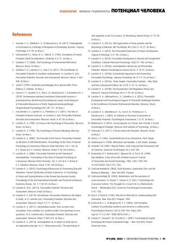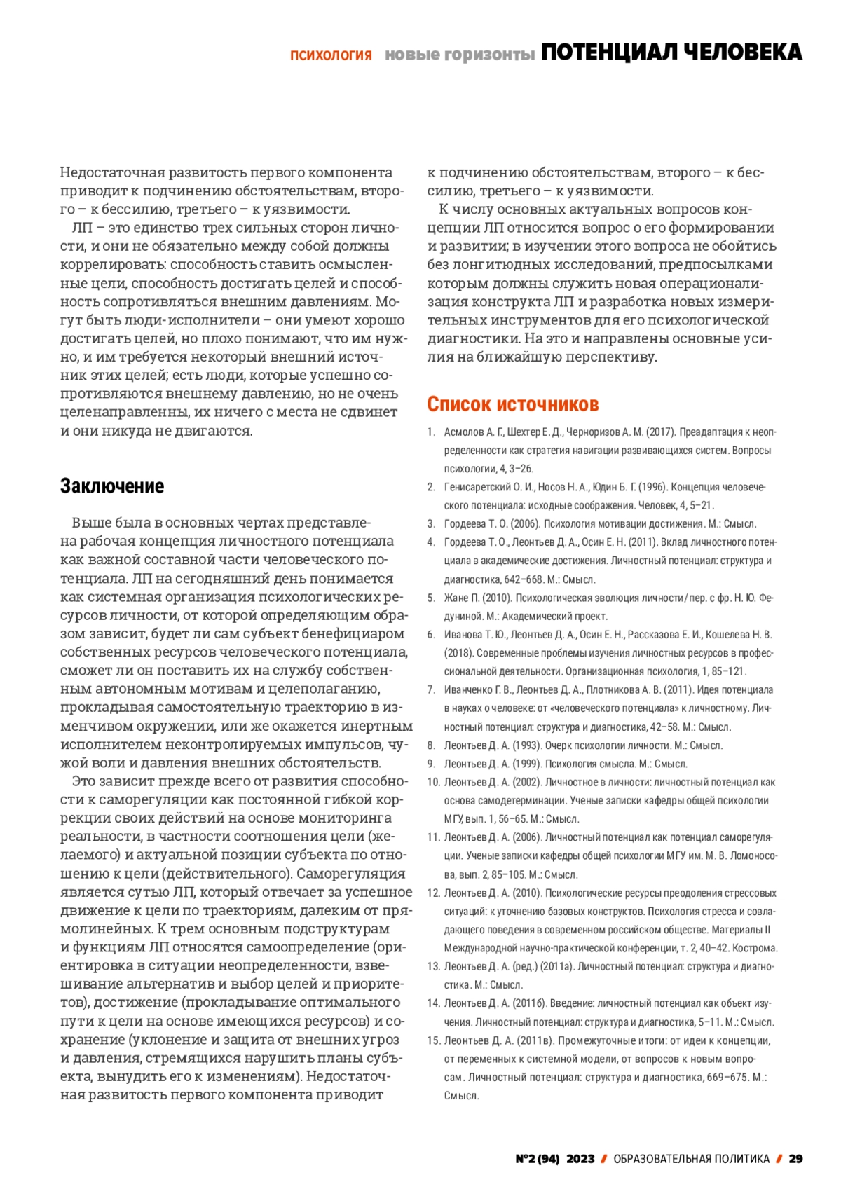 11. Леонтьев Д. А. (2006). Личностный потенциал как потенциал саморегуляции. Ученые записки кафедры общей психологии МГУ им. М. В. Ломоносова, вып. 2, 85-105. М.: Смысл.