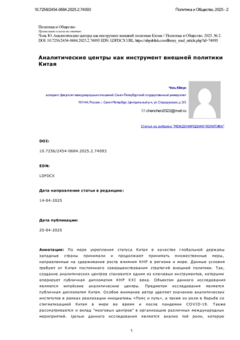 По мере укрепления статуса Китая в качестве глобальной державы западные страны принимали и продолжают принимать множественные меры, направленные на сдерживание роста влияния КНР в регионе и мире. Данные условия требуют от Китая постоянного совершенствования стратегий внешней политики. Так, создание аналитических центров становится одним из ключевых инструментов, которыми оперирует публичная дипломатия КНР XXI века. Объектом данного исследования являются китайские аналитические центры. Предметом исследования является публичная дипломатия Китая. Особое внимание автор уделяет значению аналитических институтов в рамках реализации инициативы «Пояс и путь», а также их роли в борьбе со стигматизацией Китая в мире во время и после пандемии COVID-19. Также рассматривается и вклад “мозговых центров” в организацию различных международных мероприятий. Целью данного исследования является анализ той роли, которую аналитические центры играют в реализации «мягкой силы» современного Китая. Для достижения этой цели использовался хронологический метод, позволяющий выявить эволюцию роли «мозговых центров» КНР в публичной дипломатии страны. Основными выводами, к которым приходит автор, являются: государственная значимость аналитических центров в Китае постепенно возрастает уже в 2010-х гг., при этом в 2020-х подобная тенденция не только сохраняется, но и усиливается. После пандемии COVID-19 для Китая особенную важность приобретает задача формирования и регулирования международного имиджа страны. Аналитические центры сегодня являются ключевым звеном в процессе реализации этой комплексной задачи. Также их деятельность способствует обеспечению более слаженного регионального сотрудничества со странами-партнерами Китая. Научная новизна данного исследования заключается в рассмотрении изменения роли китайских аналитических институтов под влиянием инициативы «Пояс и путь», в рамках борьбы с последствиями пандемии COVID-19 и в процессе укрепления дружественных связей со странами-партнерами КНР, а также в выдвижении гипотезы о будущем данных центров в рамках страны.