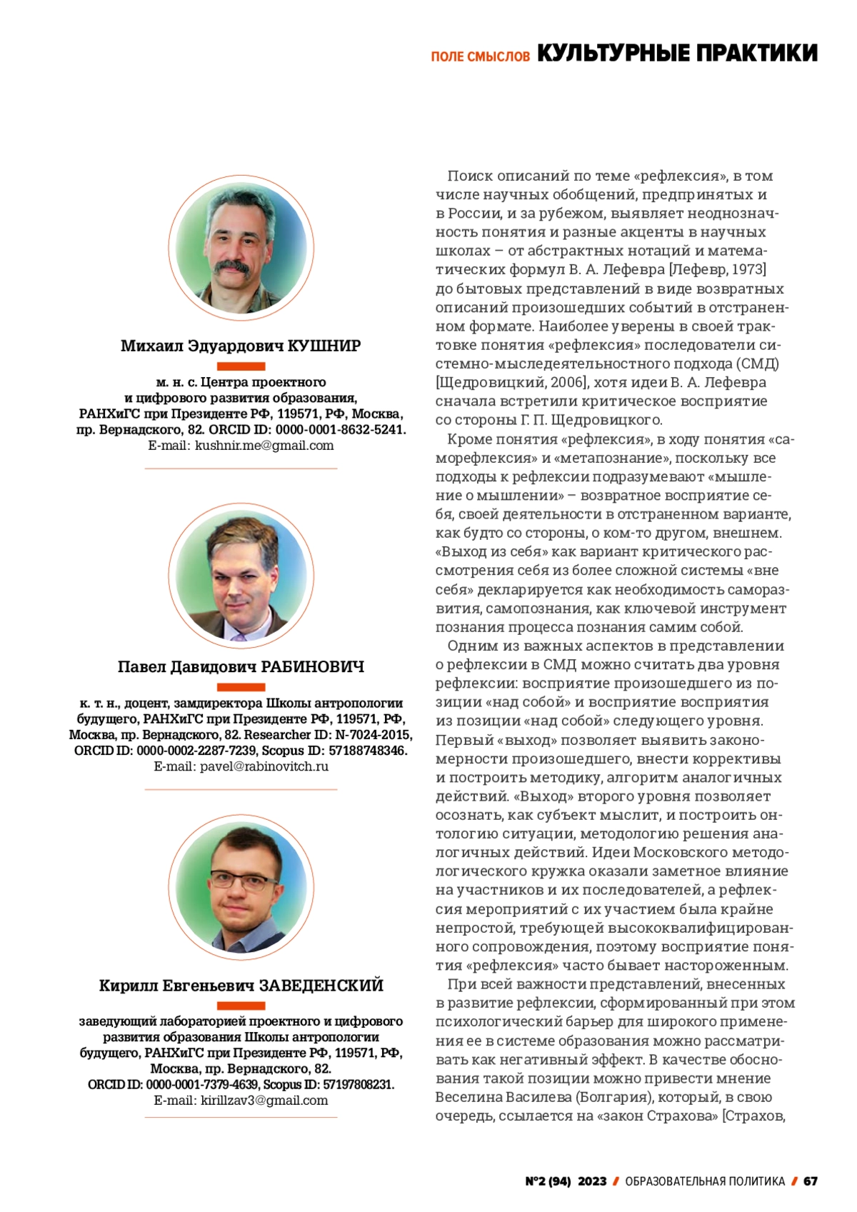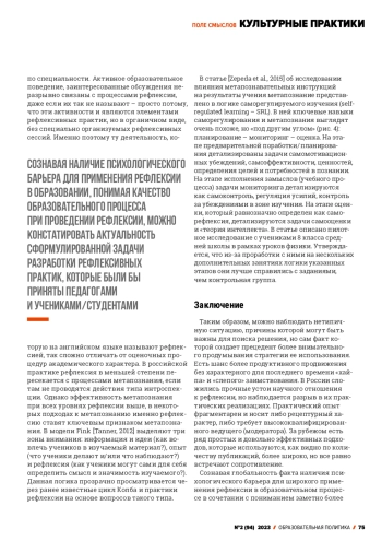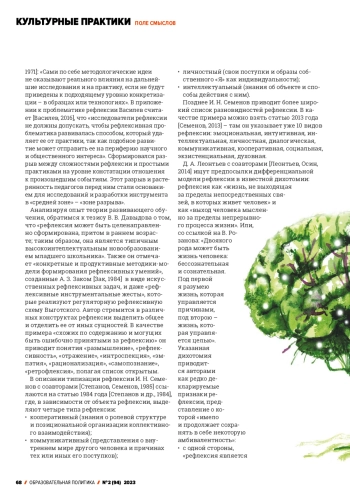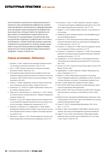 Одним из важных, но активно не используемых педагогических ресурсов поддержки и развития образовательной субъектности (активного образовательного поведения) является рефлексия / рефлексивные практики обучающихся. Как показал проект по пилотированию модели образовательного профиля «Алмаз личности» [Пилотирование…, 2022] в 2022 году, даже те школы, которые заинтересованы в развитии образовательной активности, испытывают затруднения в проведении рефлексивных практик. Были примеры, когда школы отказывались от участия в пилотном проекте такой направленности после понимания, что рефлексивные практики, предусмотренные проектом, находятся в зоне их субъектности, а не проводятся авторами проекта, и что их учителей не обучают проведению рефлексивных практик.