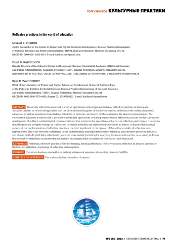Статья отражает результаты исследования подходов к реализации рефлексивных практик в России и за рубежом с целью подтверждения или опровержения гипотезы о том, что наблюдаемая неготовность учителей к проведению рефлексии с учениками в общем образовании, равно как и сопротивление со стороны учеников/студентов, носит системный характер, а также с целью найти основания наблюдаемого явления. Проведенные поисковые исследования позволили обобщить подходы к реализации рефлексивных практик для последующей разработки авторских методических рекомендаций, минимизирующих психологические барьеры участников рефлексии. Показано, что общепринятое понятие «рефлексии» в различных научных и методологических школах отсутствует. Для обсуждения практических аспектов реализации рефлексивных практик показаны наиболее значимые, по мнению авторов, модели рефлексии. Исследование выявило различия в понимании и реализации рефлексии и рефлексивных практик в России и за рубежом. В частности, в англоязычном поле рефлексия воспринимается более широко (в том числе для анализа эмоциональной реакции на событие), в России понятие «рефлексия» воспринимается более жестко и оспаривается, что считать «рефлексией», а что нет.