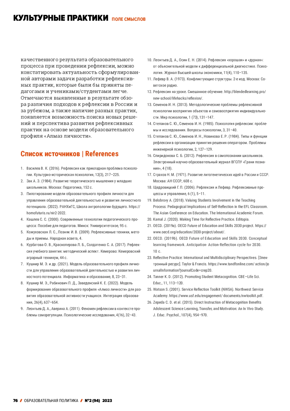 1. Василев В. К. (2016). Рефлексия как прикладная проблема психологии. Культурно-историческая психология, 12(3), 217-225. EDN: XAMPCR