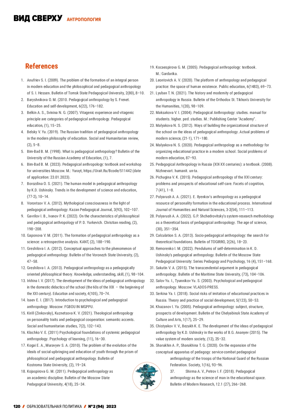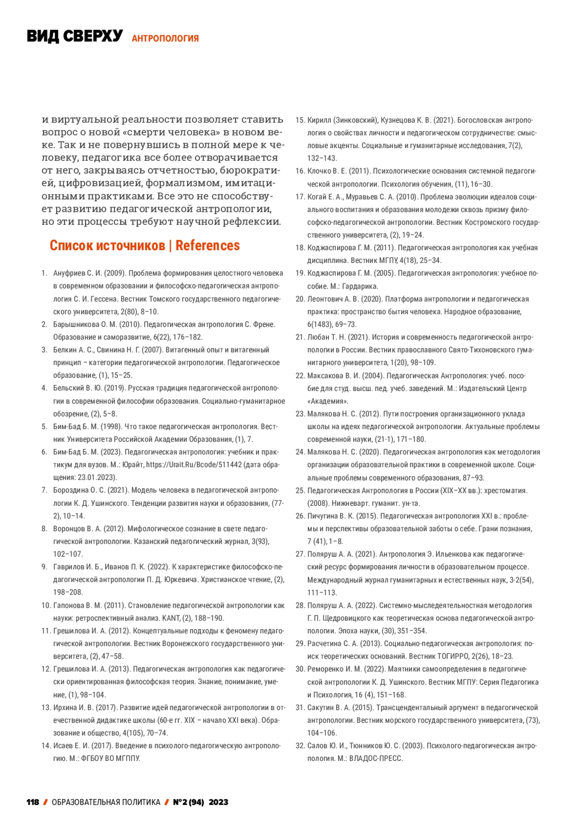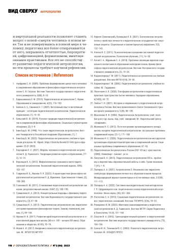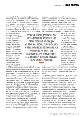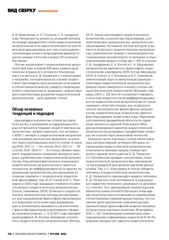 Статья: ОТЕЧЕСТВЕННАЯ ПЕДАГОГИЧЕСКАЯ АНТРОПОЛОГИЯ: АНАЛИЗ ТЕНДЕНЦИЙ ПЕРВОЙ ЧЕТВЕРТИ XXI ВЕКА (2023)